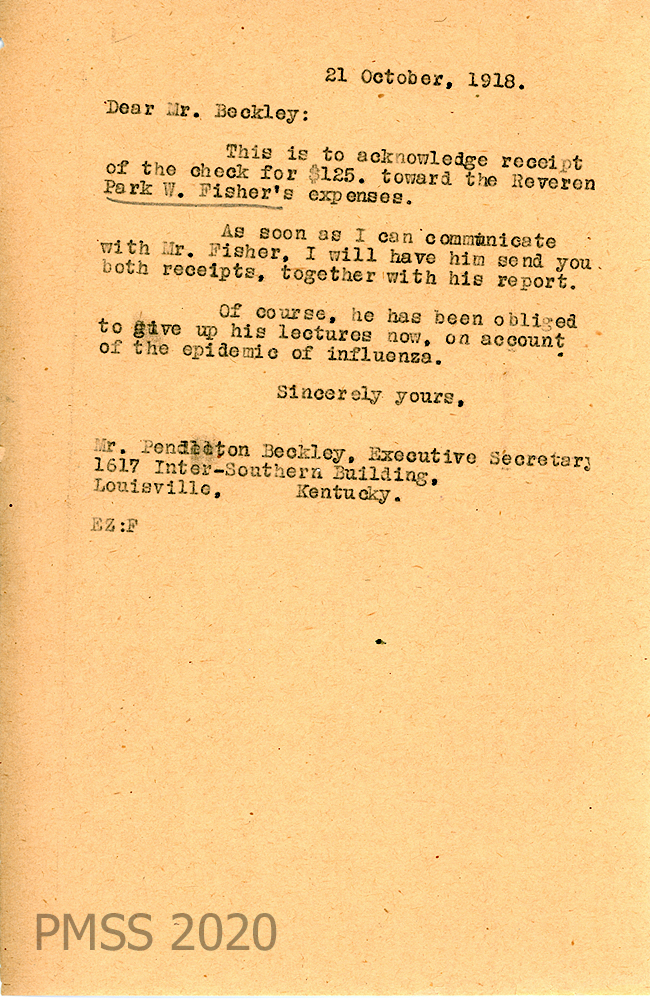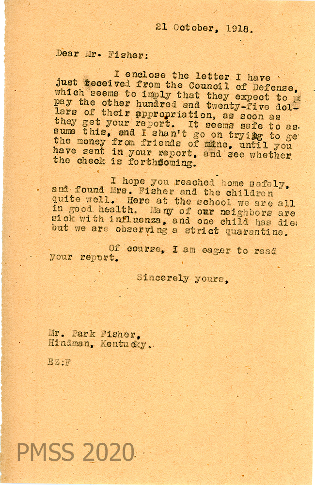 [072] October 21, 1918. To Fisher, HIndman, KY, from EZ (Zande). Encloses the Council of Defense’s letter stating that the other $125 will be forthcoming pending a report from Fisher. She hopes he has returned home safely; many PMSS neighbors are sick with influenza but PMSS is under strict quarantine.