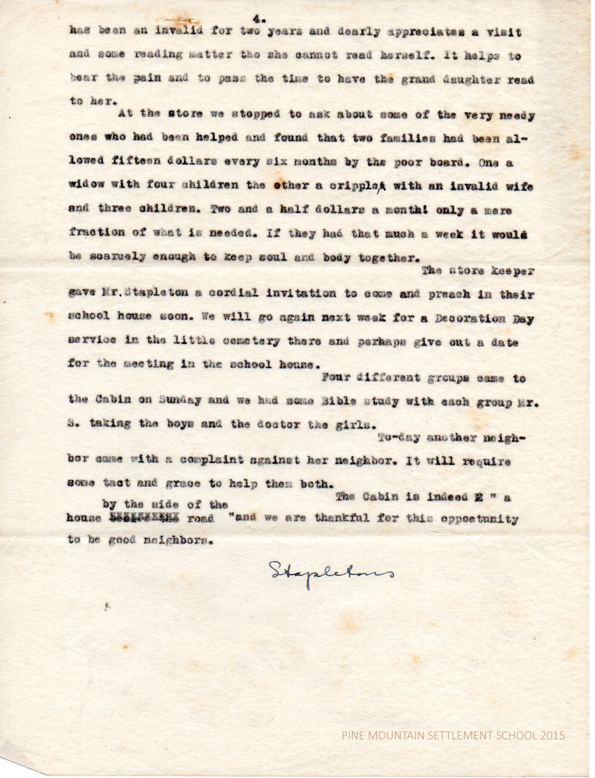 TAGS: Stapleton Report May 1930, Dr. Ida S. Stapleton, Rev. Stapleton, Line Fork Settlement, PMSS pageant, community activities, James S. Crutchfield, PMSS graduation, medical work, poor board, the Cabin, poetry