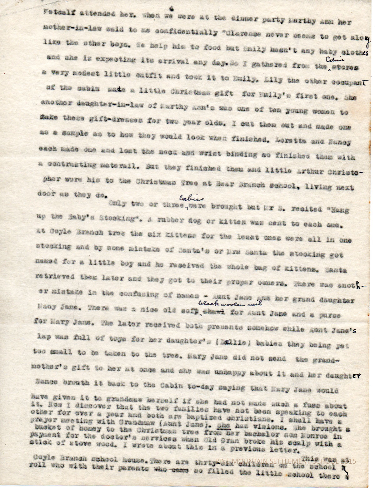 Only two or three babies were brought but Mr S recited “Hung up the Baby’s Stocking”. A rubber dog or kitten was sent to each one. At Coyle Branch tree the six kittens for the least ones were all in one stocking and by some mistake of Santa’s or Mrs Santa the stocking got named for a little boy and he received the whole bag of kittens. Santa retrieved them later and they got to their proper owners. There was another mistake in the confusing of names – Aunt Jane and her granddaughter Mary Jane. There was a nice old soft black woolen veil for Aunt Jane and a purse for Mary Jane. The latter received both presents somehow while Aunt Jane’s lap was full of toys for her daughter’s (Dellie) babies they being yet too small to be taken to the tree. Mary Jane did not send the grandmother’s gift to her at once and she was unhappy about it and her daughter Nance brought it back to the Cabin to-day saying that Mary Jane would have given it to grandmaw herself if she had not made such a fuss about it. Now I discover that the two families have not been speaking to each other for over a year and both are baptized Christians. I shall have a prayer meeting with Grandmaw (Aunt Jane). She has visions. She brought a bucket of honey to the Christmas tree from her bachelor son Monroe in payment for the doctor’s services when Old Gran broke his scalp with a stick of stove wood. I wrote about this in a previous letter.