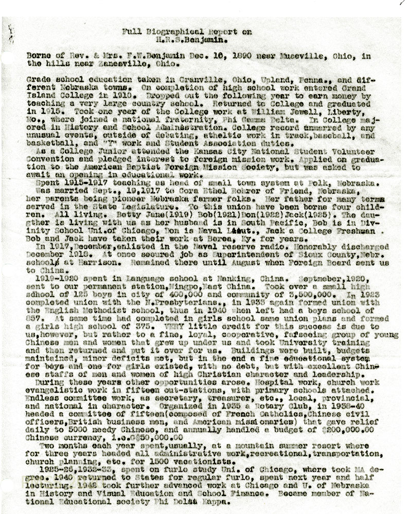 Both Mr. Benjamin and his wife grew up in Nebraska, and are graduates of Grand Island [Nebraska] College and the University of Nebraska respectively. After the First World War, in which Mr. Benjamin served in the Naval Reserve, they went to China, where they worked from 1919 to 1940 under the Foreign Board of the Northern Baptist Convention, building up in Ningpo, East China, educational, religious, social and medical work of an extensive nature. Mr. Benjamin holds an M.A. in Education from the University of Chicago. Since 1940, when a furlough turned perforce into an extended stay in this country, he has been working in a college for [North American] Indians at Bacone, Oklahoma. One son and a son-in-law are in the services, another son is still in college at Berea. …
