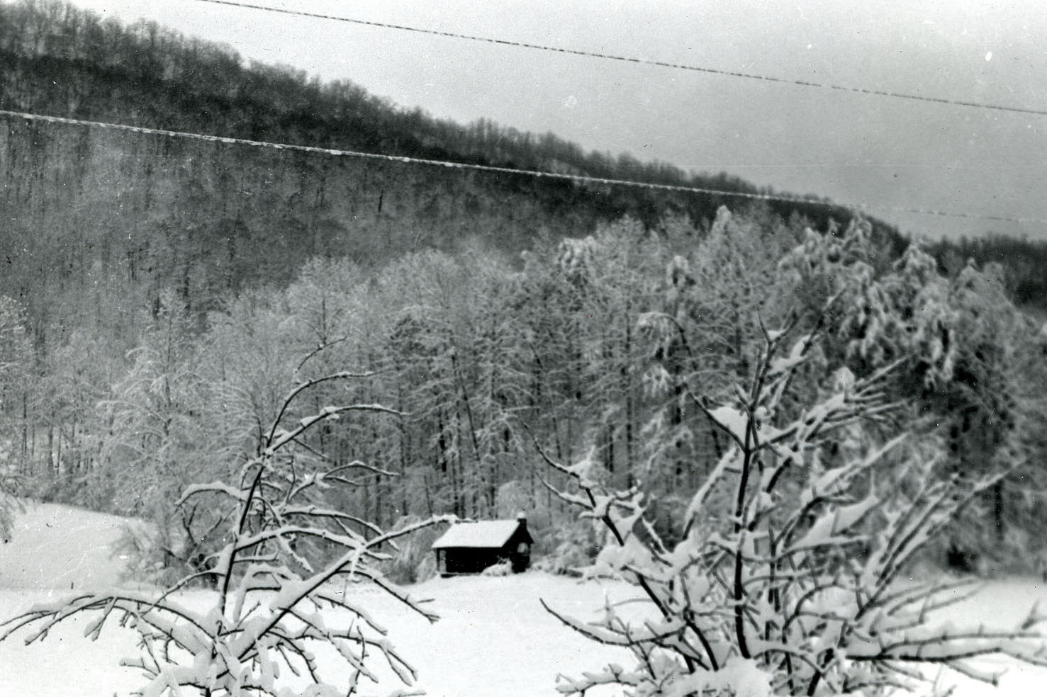 - Creech Cabin in the snow, 1965, distant view. [II_11-02_creech_cabin_0402a-2.jpg]