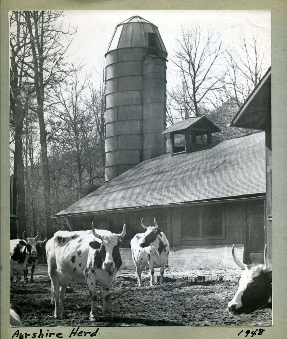 - “Ayrshire Herd 1948.” Barn and silo in background. [nace_II_album_041.jpg]