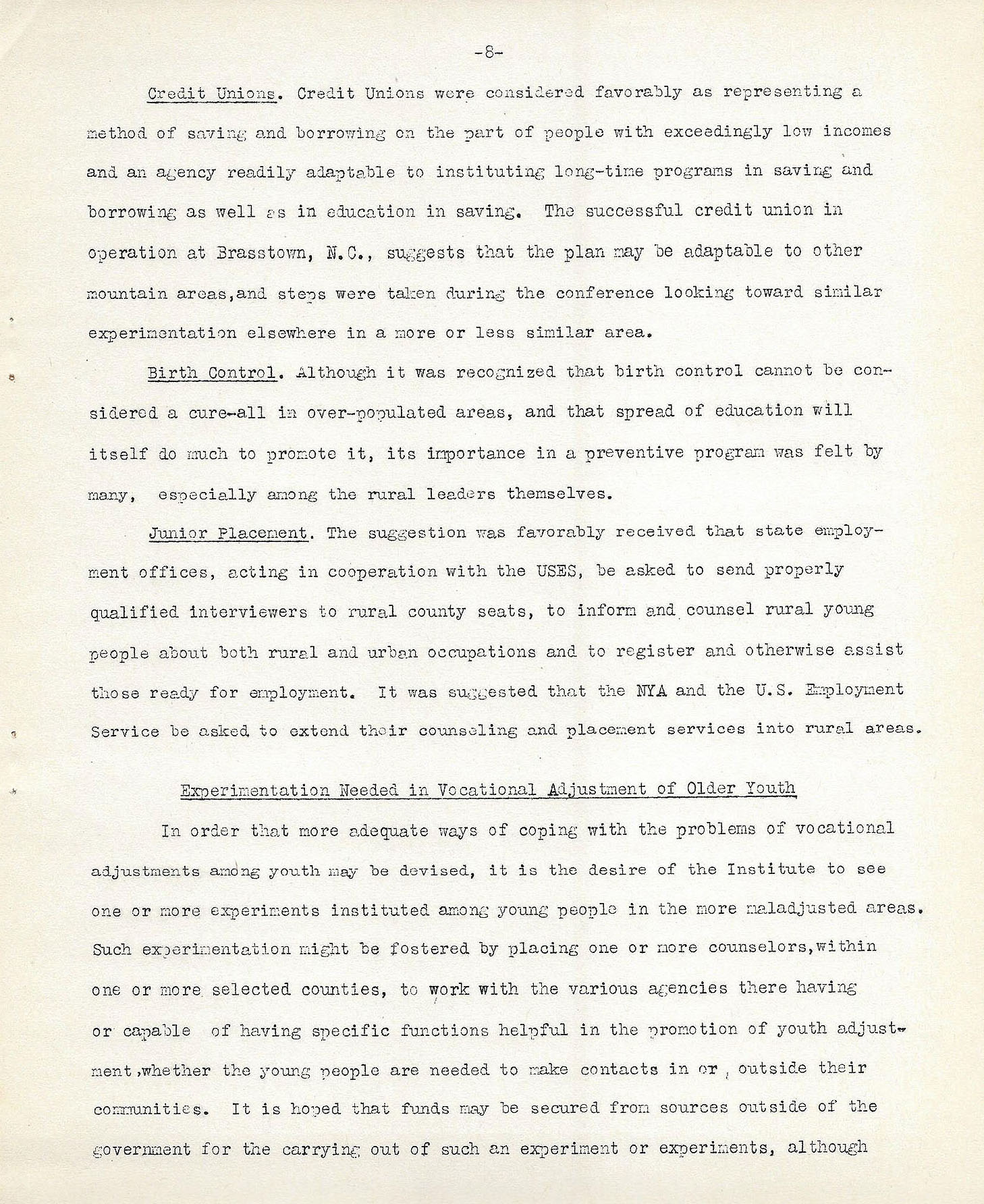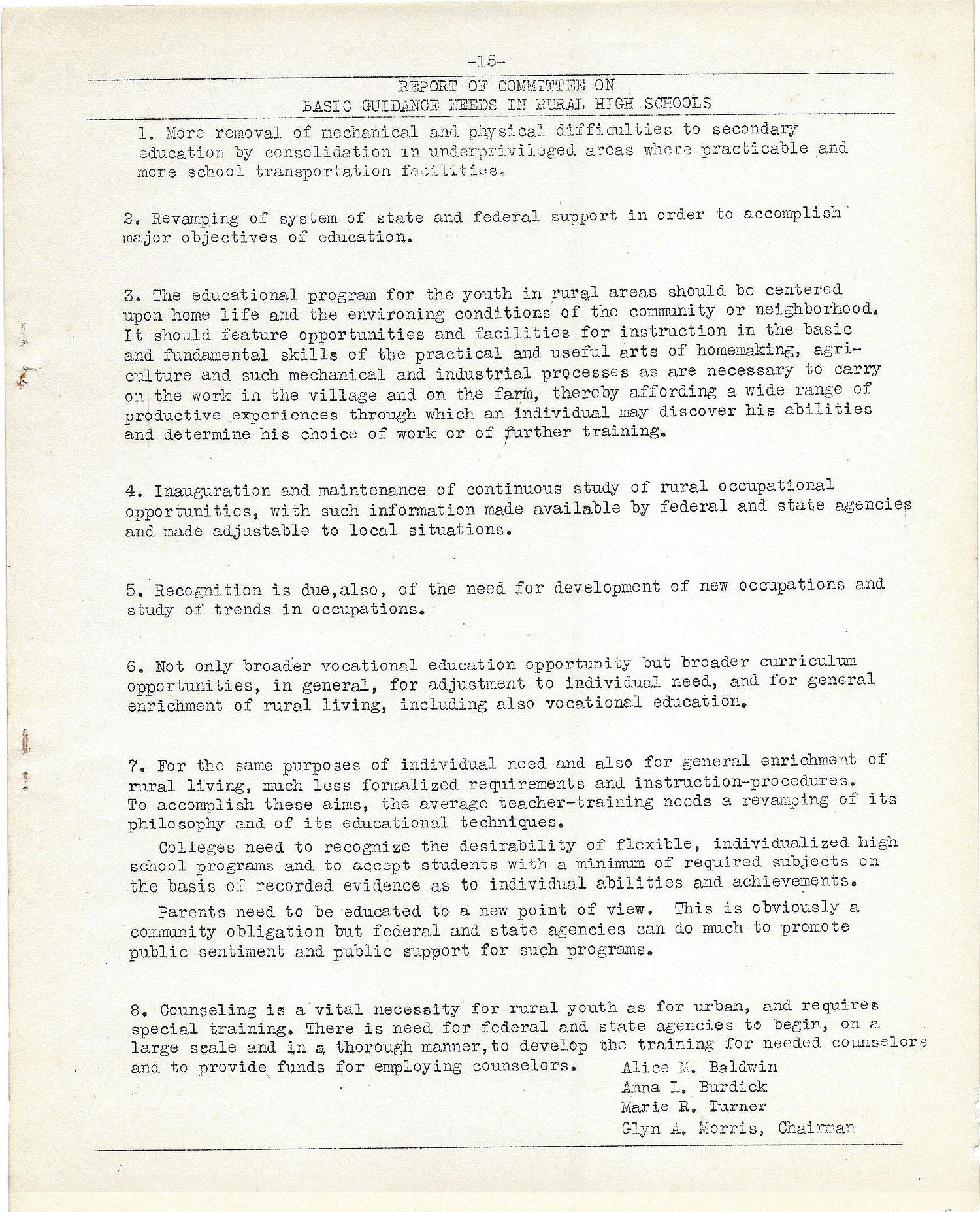 8. Counseling is a vital necessity for rural youth as for urban, and requires special training. There is need for federal and state agencies to begin, on a large scale and in a thorough manner, to develop the training for needed counselors and to provide funds for employing counselors.