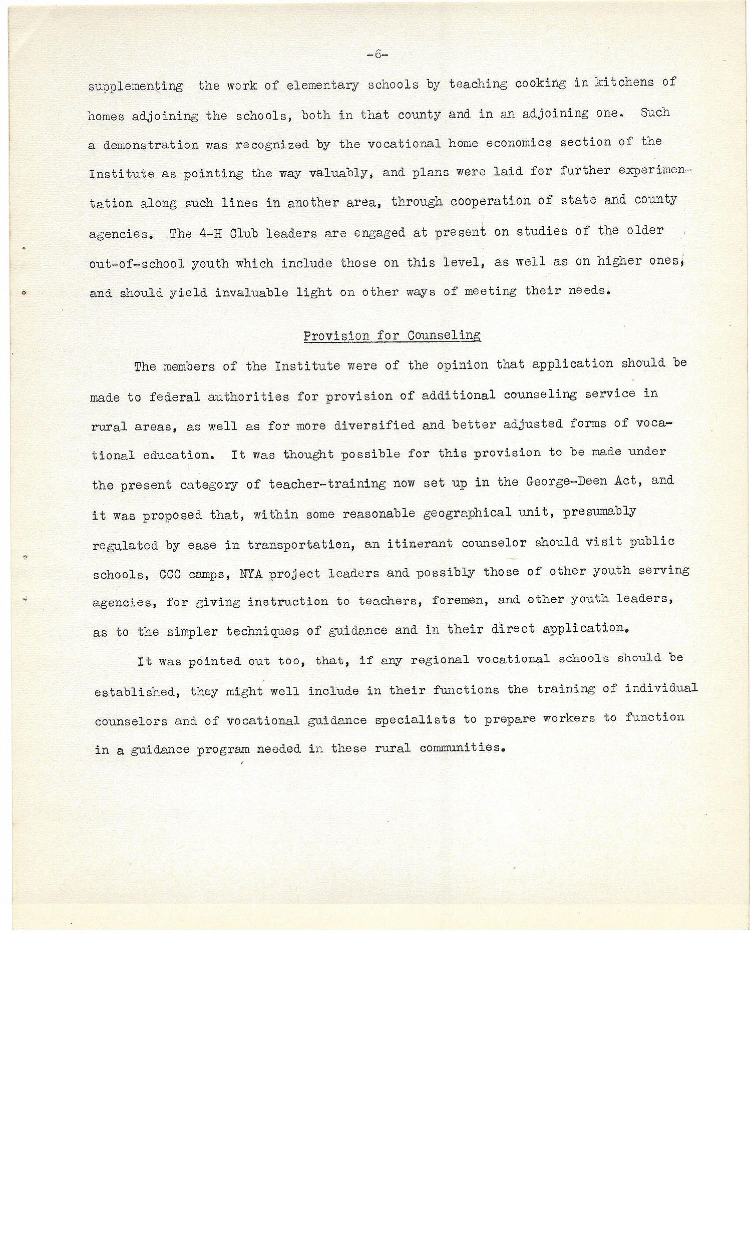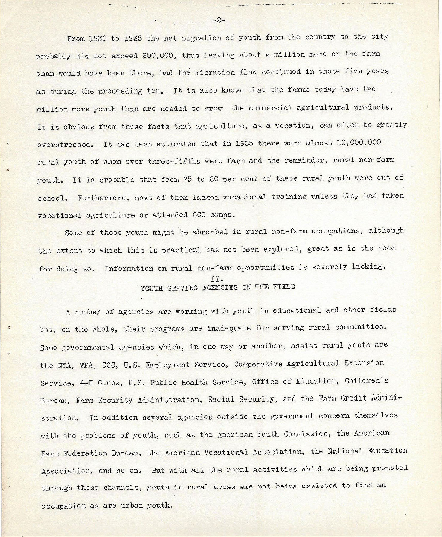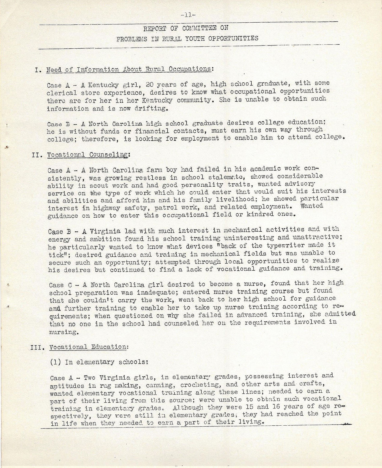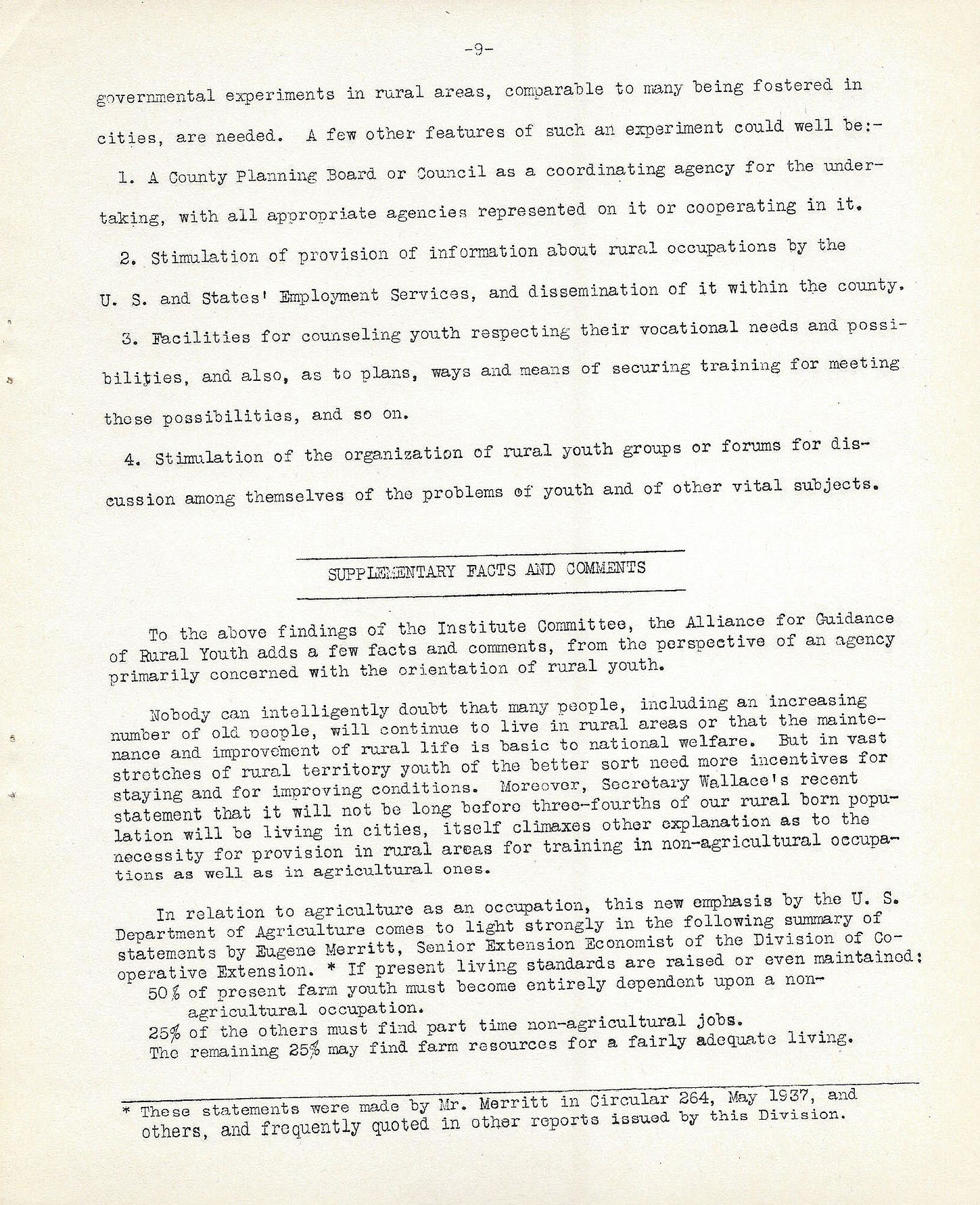 TAGS: Rural Youth Guidance Institute 1937 Findings, youth leaders, Alliance for Guidance of Rural Youth, rural youth needs, vocational counseling, vocational education, guidance programs, youth migration to city, agriculture as a vocation, CCC camps, U.S. Employment Service, Homeplace, 4-H Clubs, George-Deen Act