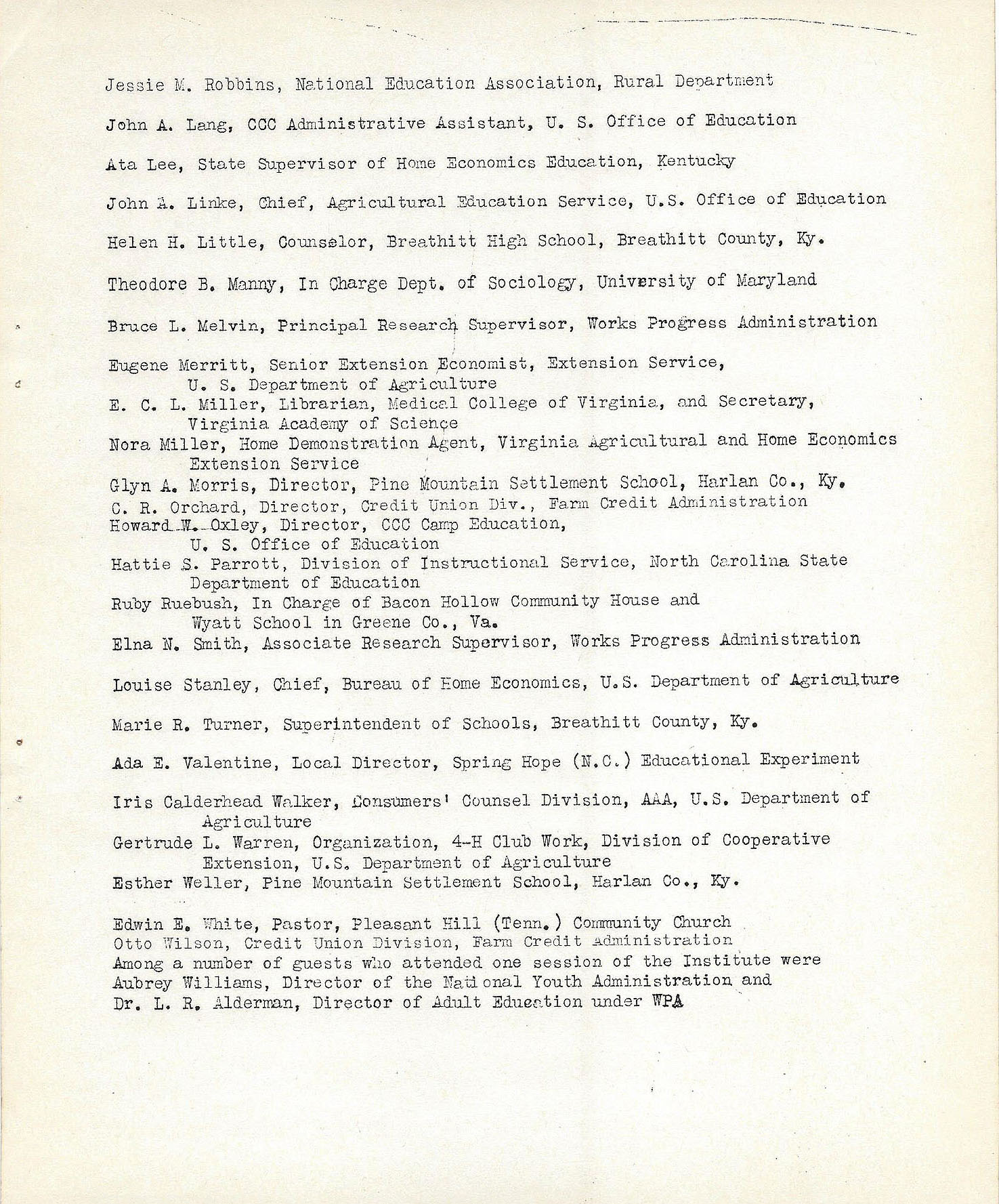 Among a number of guests who attended one session of the Institute were Aubrey Williams, Director of the National Youth Administration and Dr. L. R. Alderman, Director of Adult Education under WPA.