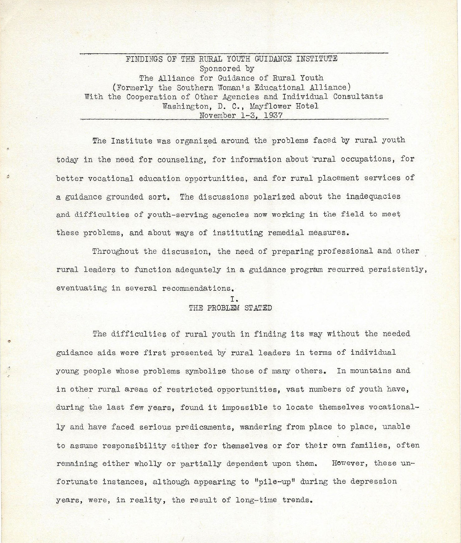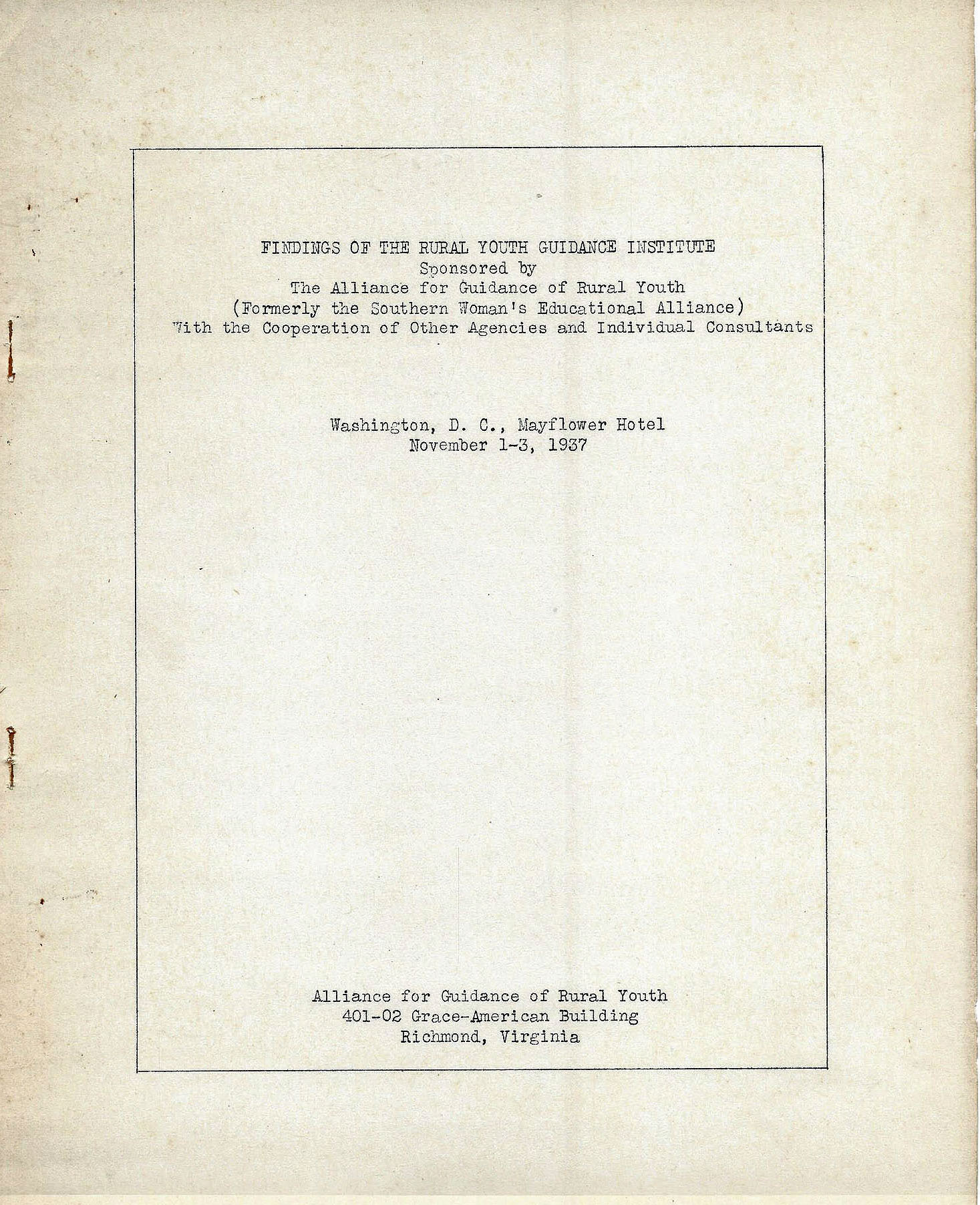 The cover of the RURAL YOUTH GUIDANCE INSTITUTE 1937 FINDINGS indicates that this convention of youth leaders was sponsored by the Alliance for Guidance of Rural Youth (formerly, the Southern Woman’s Educational Alliance) with the cooperation of other agencies and individual consultants. It was held on November 1-3, 1937, at the Mayflower Hotel located in Washington, DC.