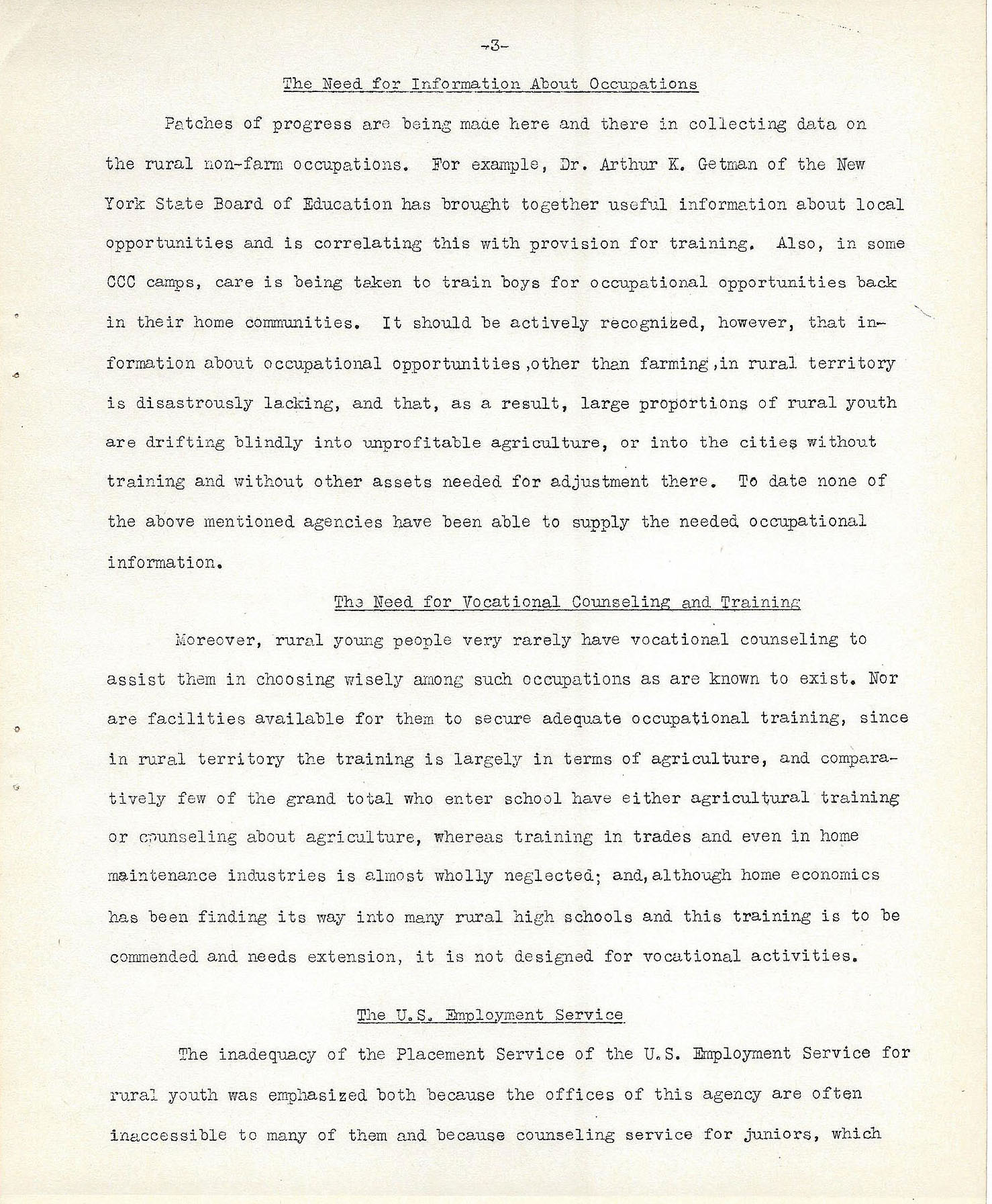 Patches of progress are being made here and there in collecting data on the rural non-farm occupations. For example, Dr. Arthur K. Getman of the New York State Board of Education has brought together useful information about local opportunities and is correlating this with provision for training. Also, in some CCC camps, care is being taken to train boys for occupational opportunities back in their home communities. It should be actively recognized, however, that information about occupational opportunities, other than farming, in rural territory is disastrously lacking, and that, as a result, large proportions of rural youth are drifting blindly into unprofitable agriculture, or into the cities without training and without other assets needed for adjustment there. To date none of the above mentioned agencies have been able to supply the needed occupational information.