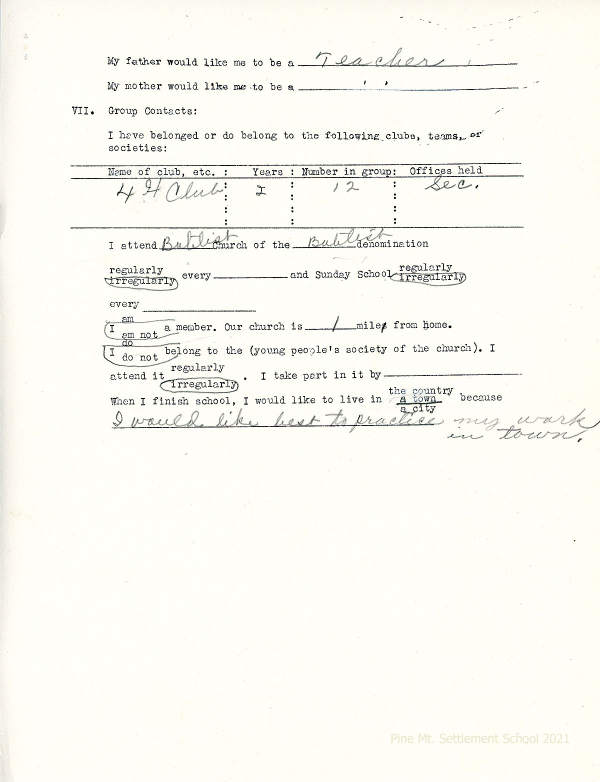 [005e] … VII. Group Contacts: 4H Club, 2 years. … When I finish school, I would like to live in “a town” because I would like best to practice my work in town.