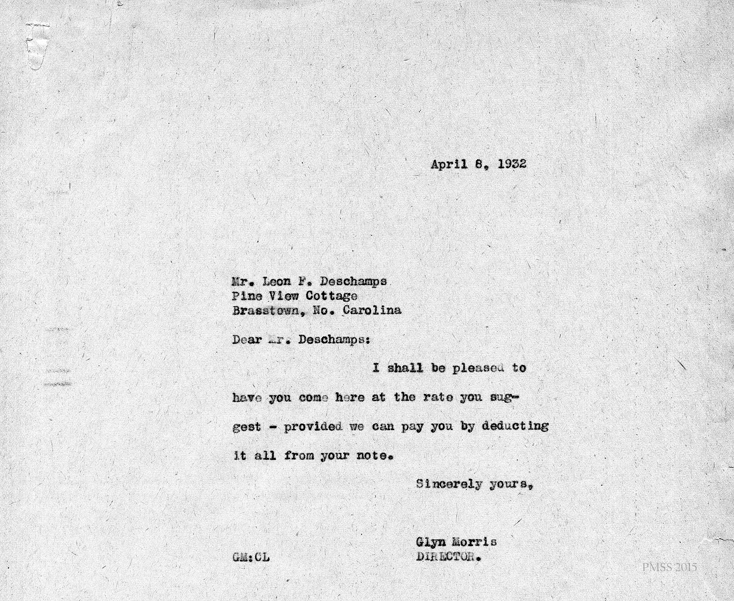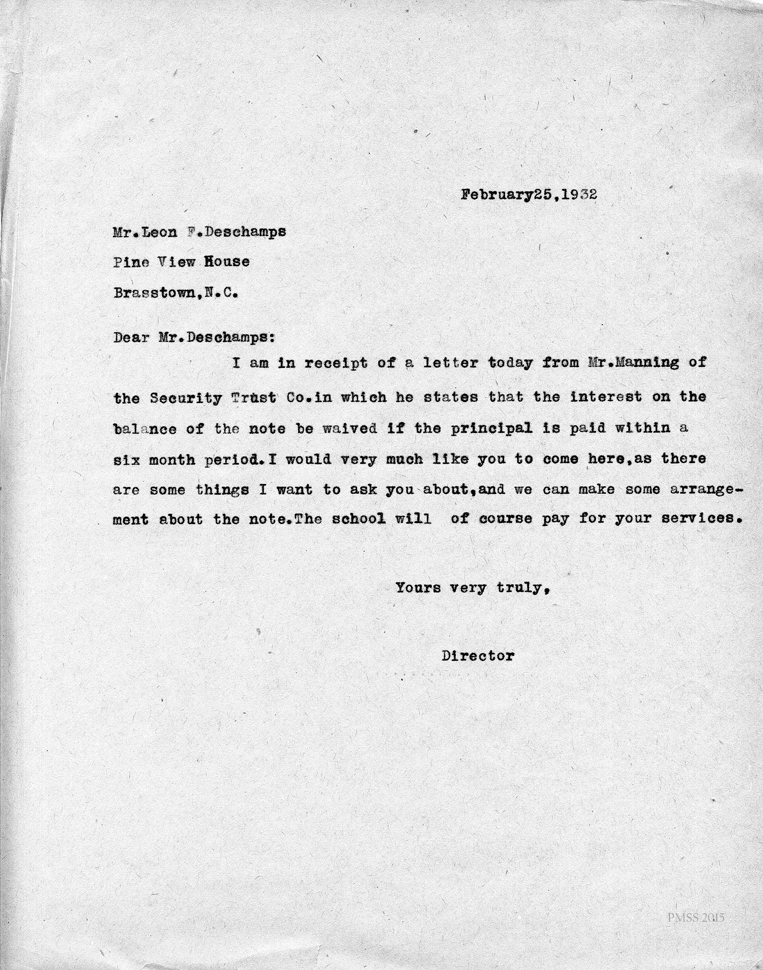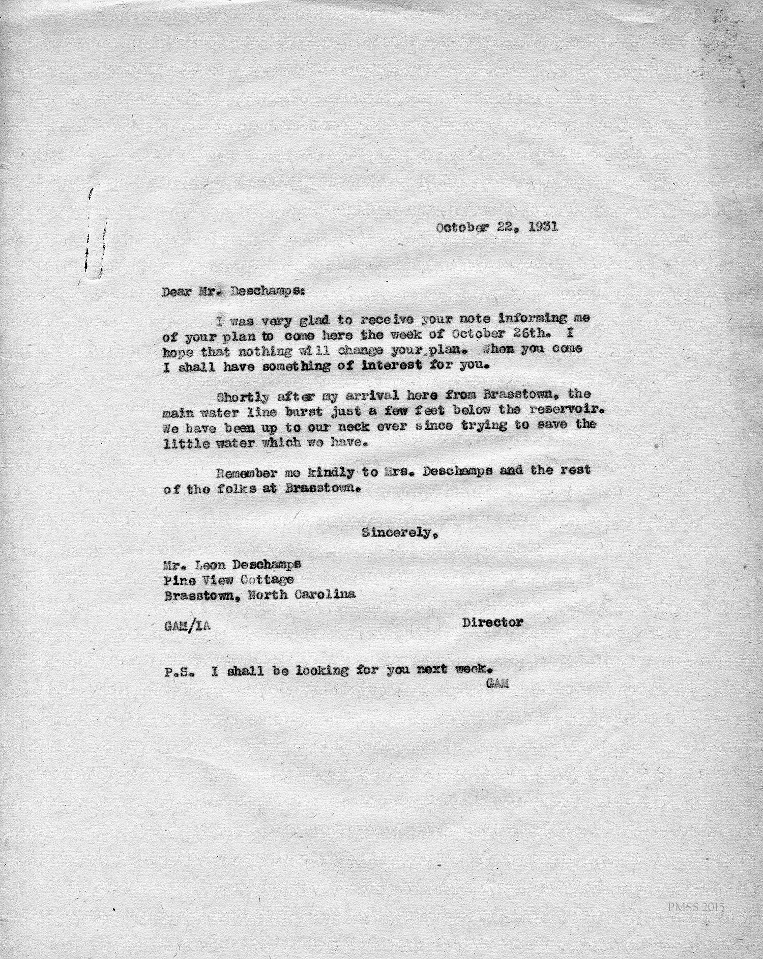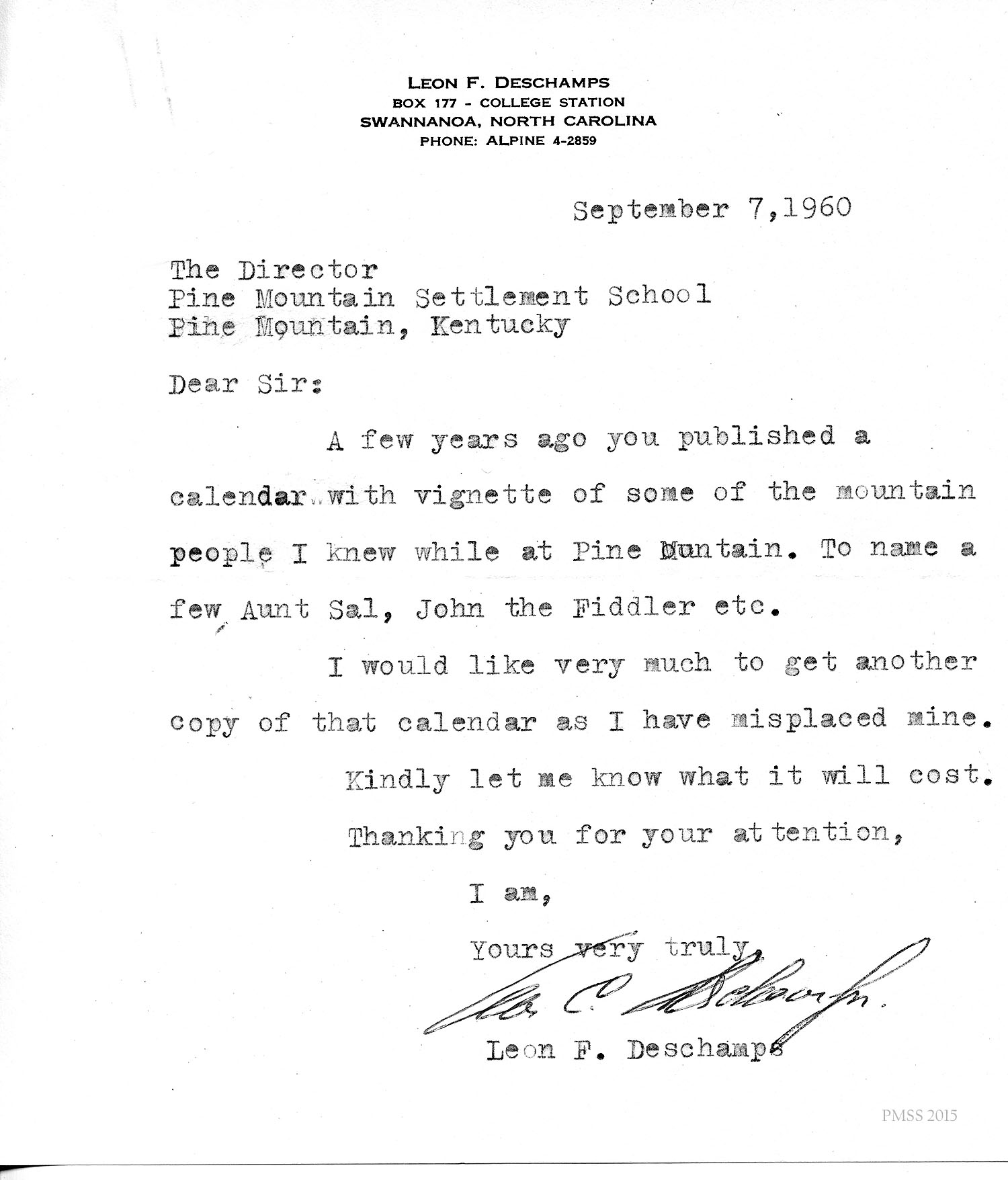 Deschamps in Swannanoa, NC, to “The Director” at PMSS: Asks for a copy of the PMSS calendar.