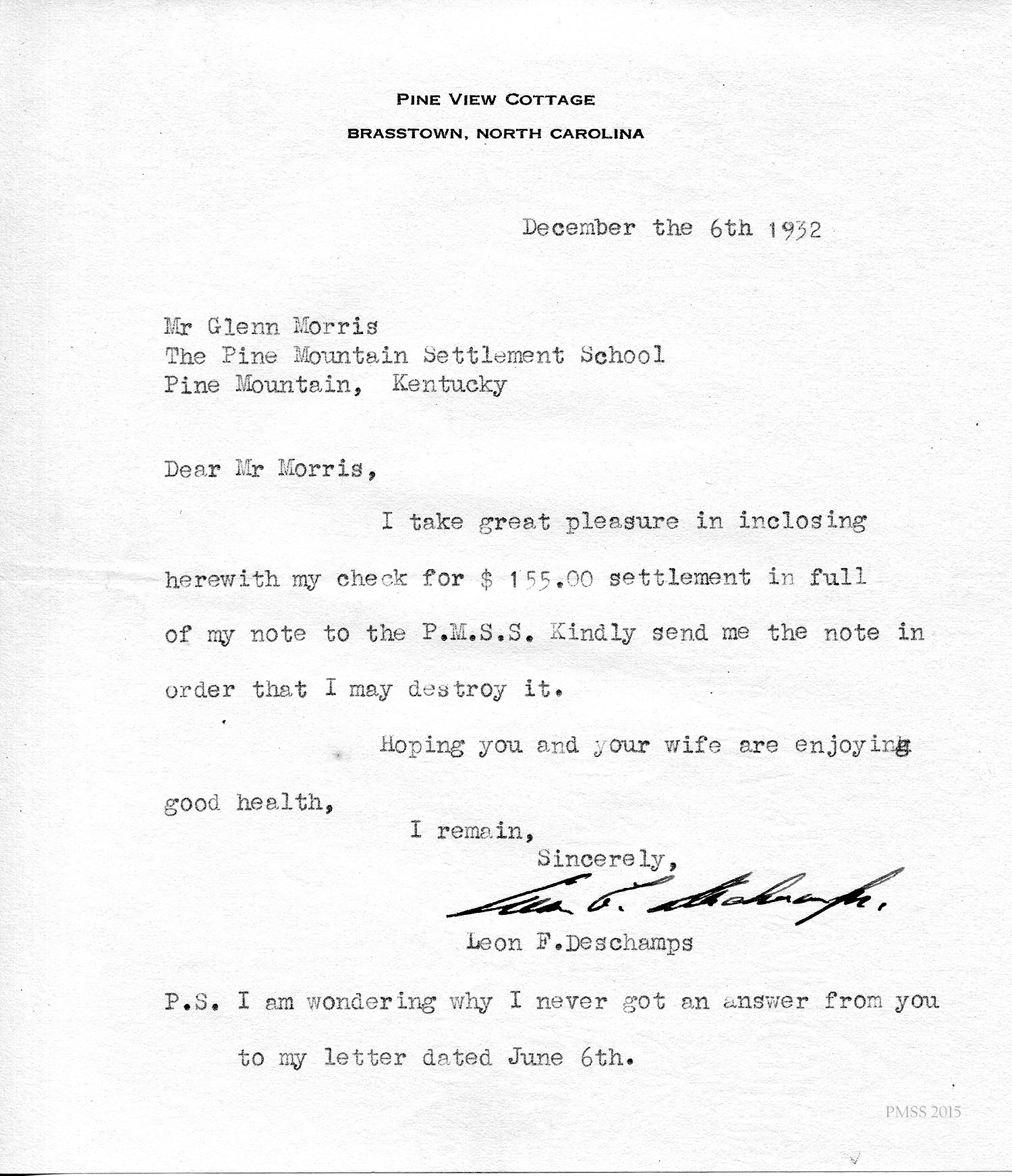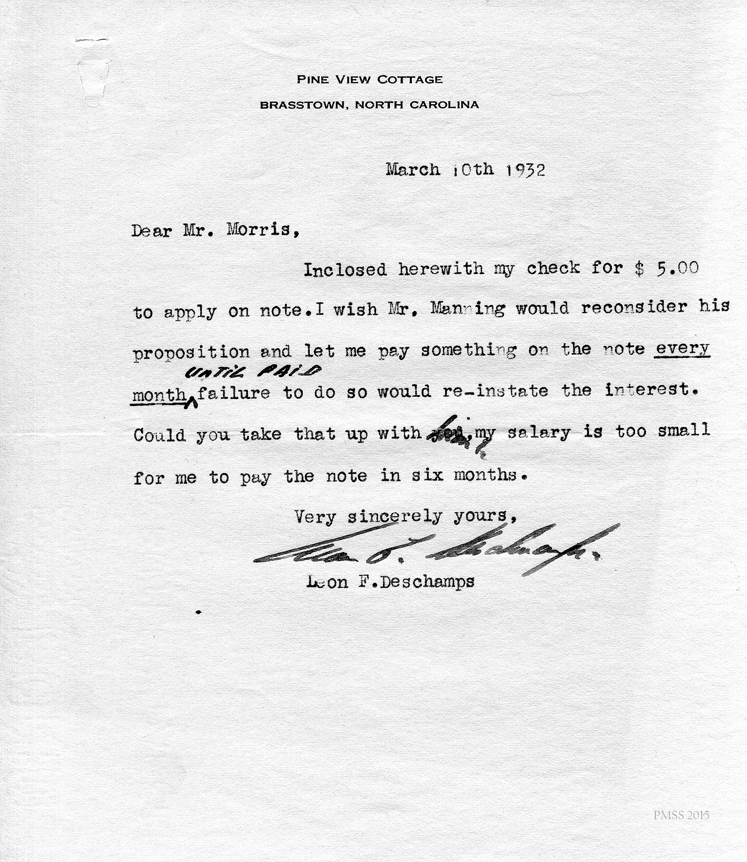 [unsigned] “EZ” (Ethel Zande) to “Leon”: Asks Deschamps to pay towards his loan from PMSS; Granny Creech.