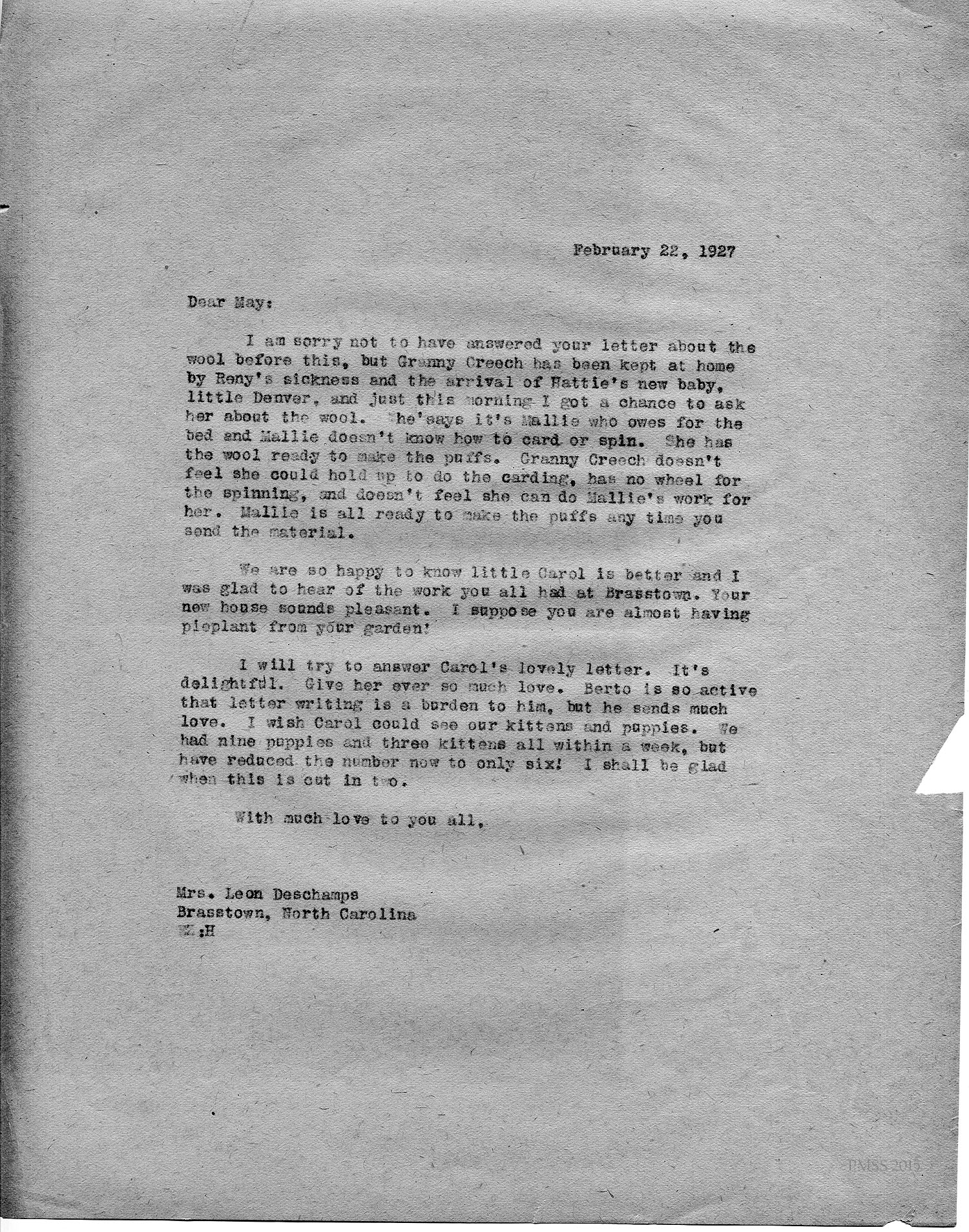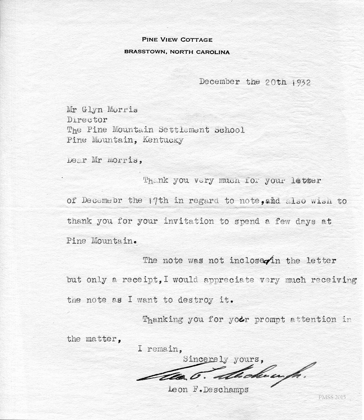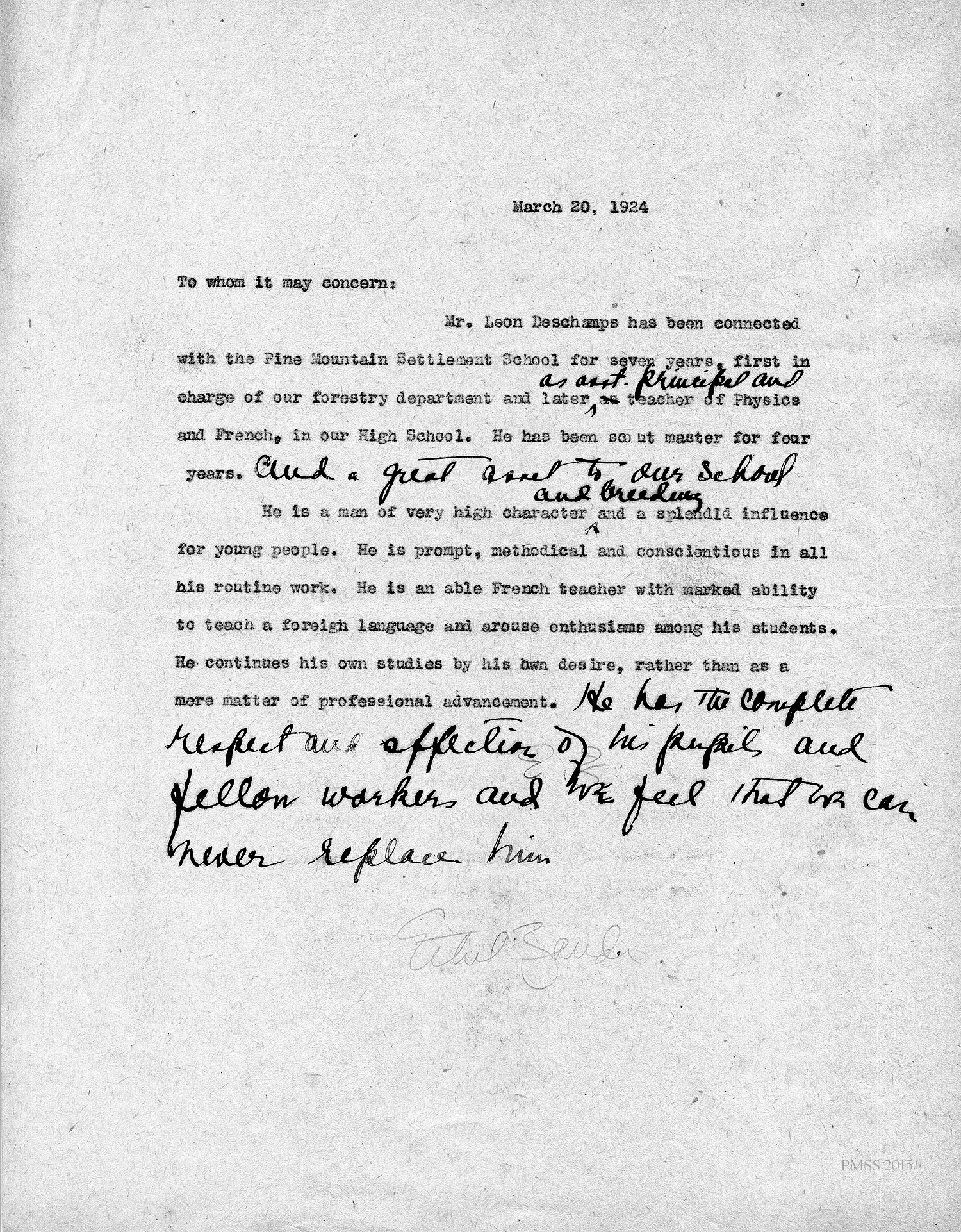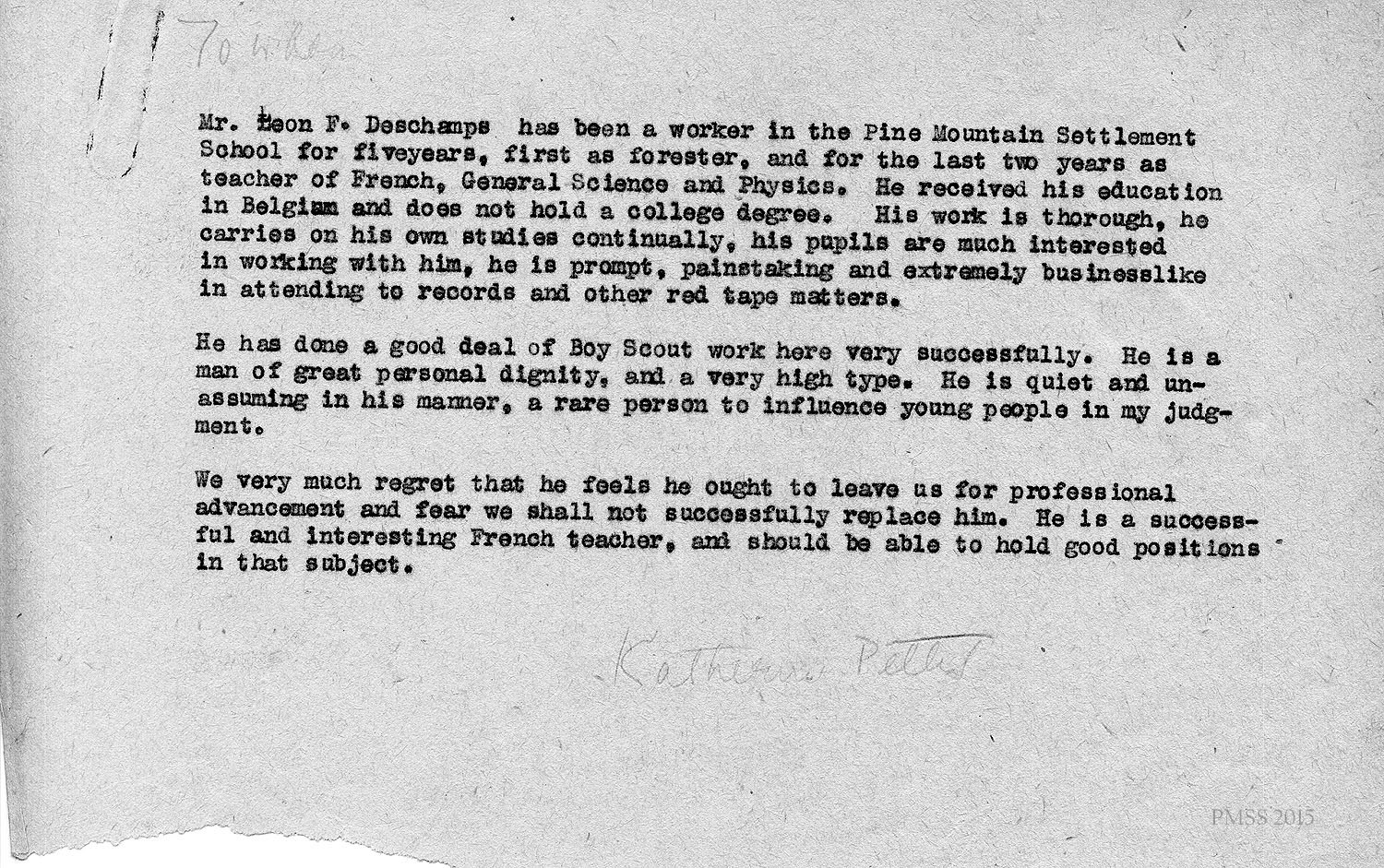 Evelyn Wells, Secretary, Pine Mt. School “to whom it may concern”: Draft letter of recommendation for Deschamps.