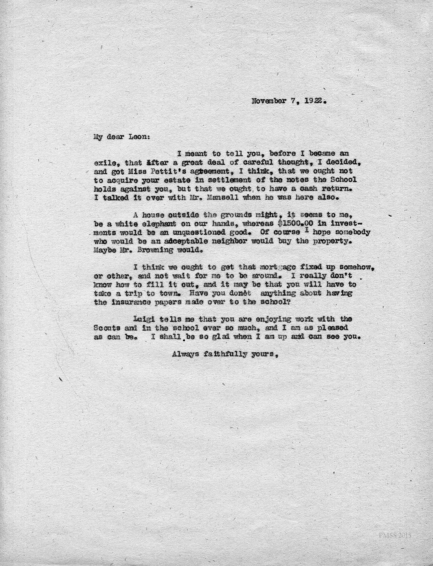 [unsigned] to Leon: Miss Pettit and I agree that PMSS ought not to acquire Leon’s estate in settlement of the notes the School holds against him, but that the School should have a cash return; Mr. Mensell agrees; Mr. Browning; mortgage; insurance papers; Luigi (Zande).