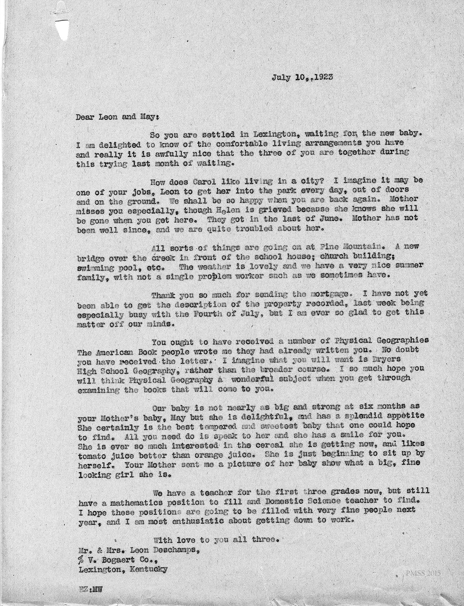 [unsigned] “EZ” (Ethel Zande) to Leon and May, c/o V. Bogart Co., in Lexington, KY: New baby to arrive; Carol; Mother and Helen (de Long) miss you; new bridge over creek; church building; swimming pool; mortgage; Physical Geographics from The American Book; Dryers High School Geography; babies; teachers.
