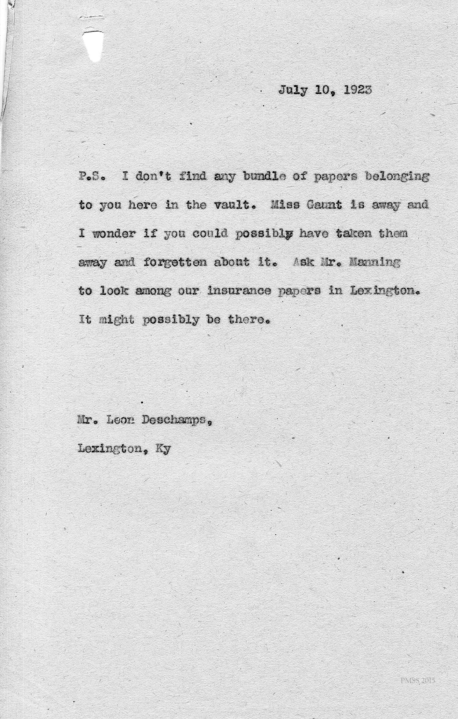 [unsigned] to Leon Deschamps in Lexington, KY: Cannot find Leon’s papers in the vault; Miss [Bessie V.] Gaunt is away; ask Mr. [Charles N.] Manning.