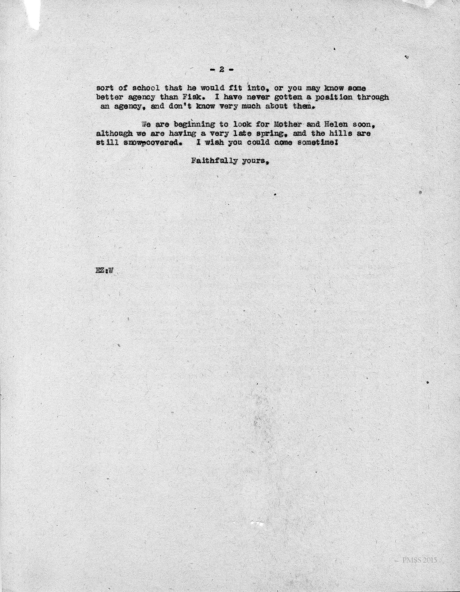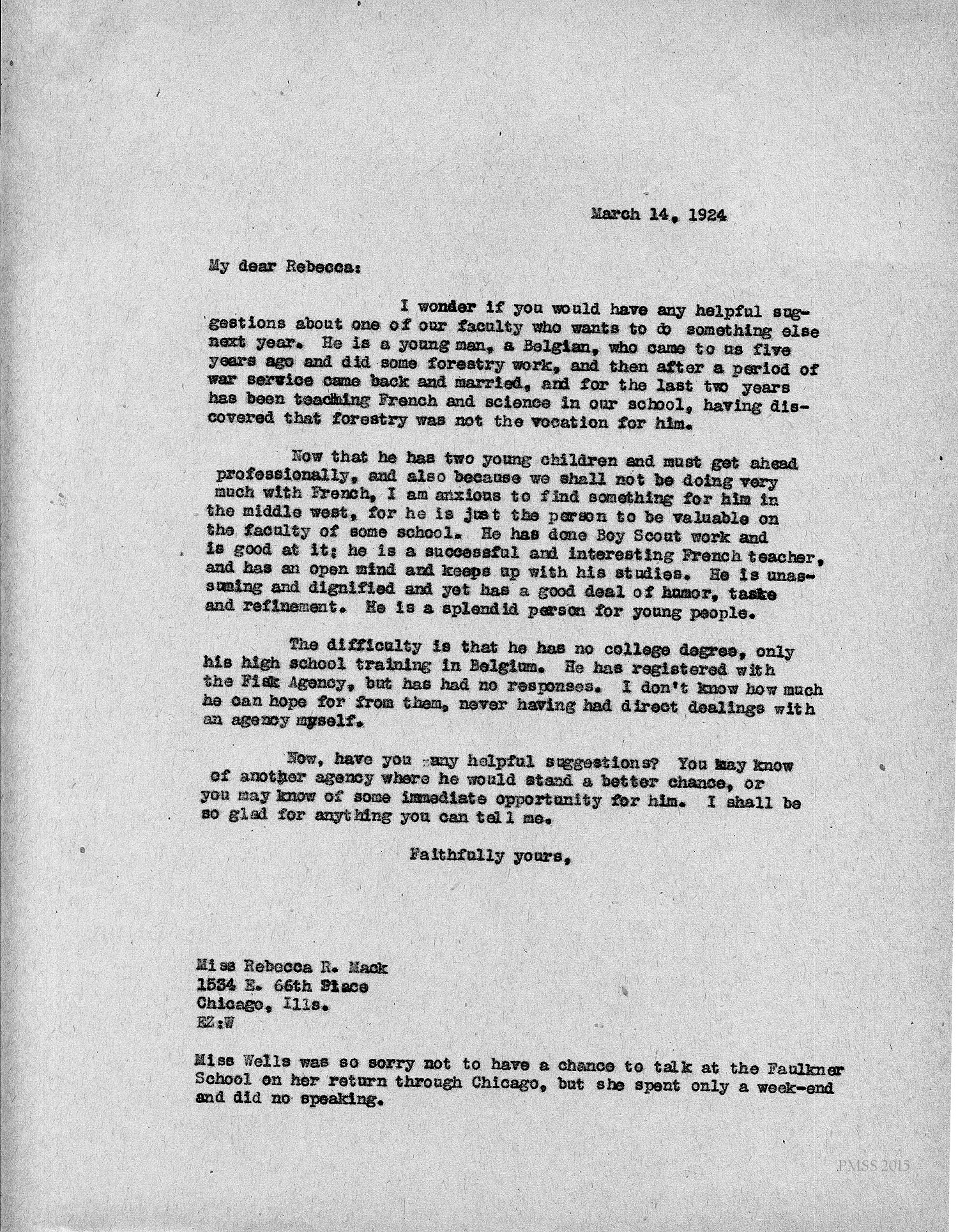 [unsigned] “EZ” (Ethel Zande) to Rebecca R. Mack in Chicago, IL: Asks for suggestions for young man (Deschamps) who has been teaching French, and science at PMSS and wants to get ahead professionally; describes his credentials; Miss (Evelyn) Wells sorry to miss talking at the Faulkner School in Chicago.