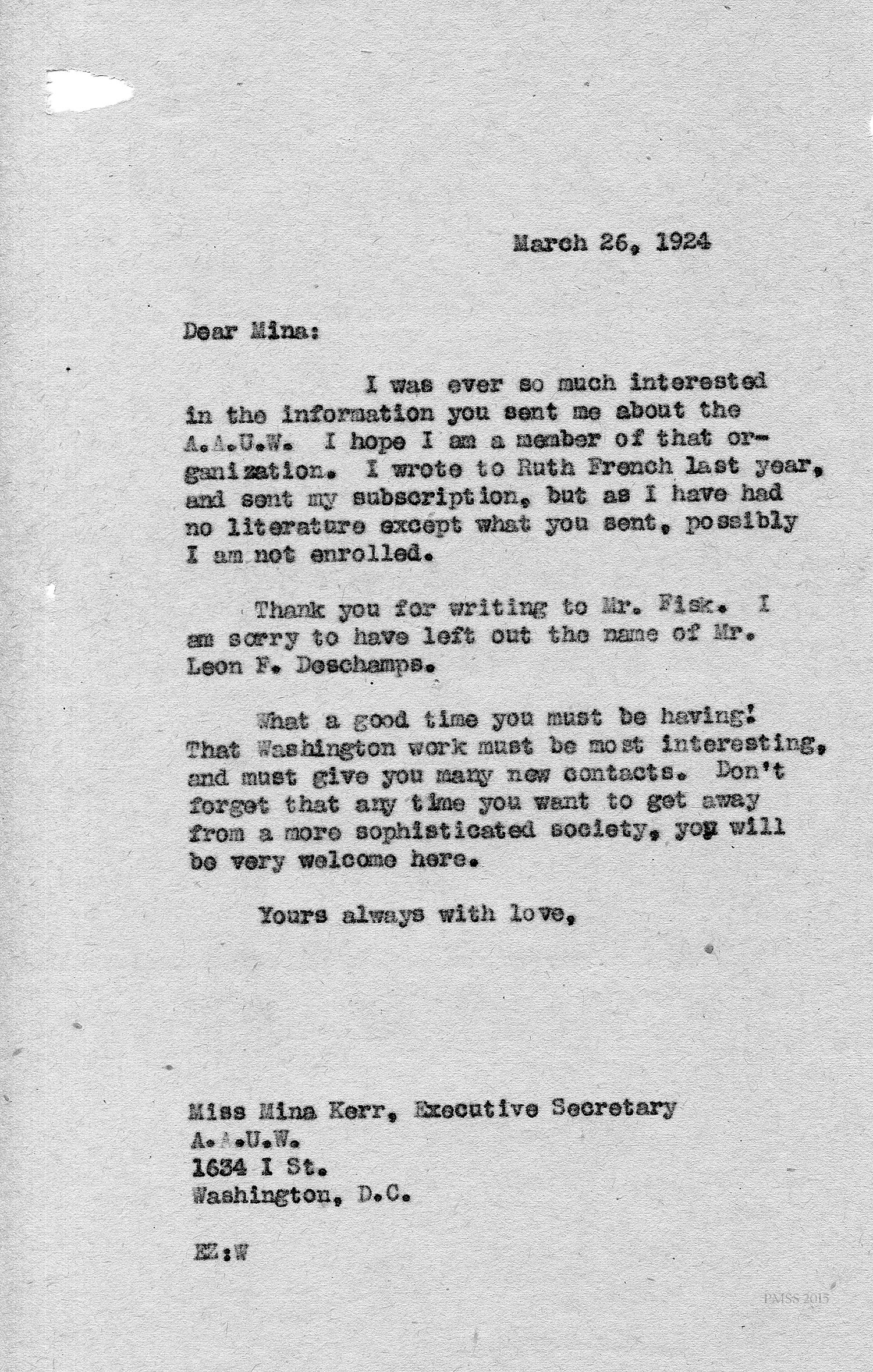 Mina Kerr, Exec. Secy., American Association of University Women in Washington, DC, to “Ethel” (DeLong Zande): Responding to March 14 letter: Will forward Deschamps’ name to Mr. Fisk, whom she knows well; AAUW information.