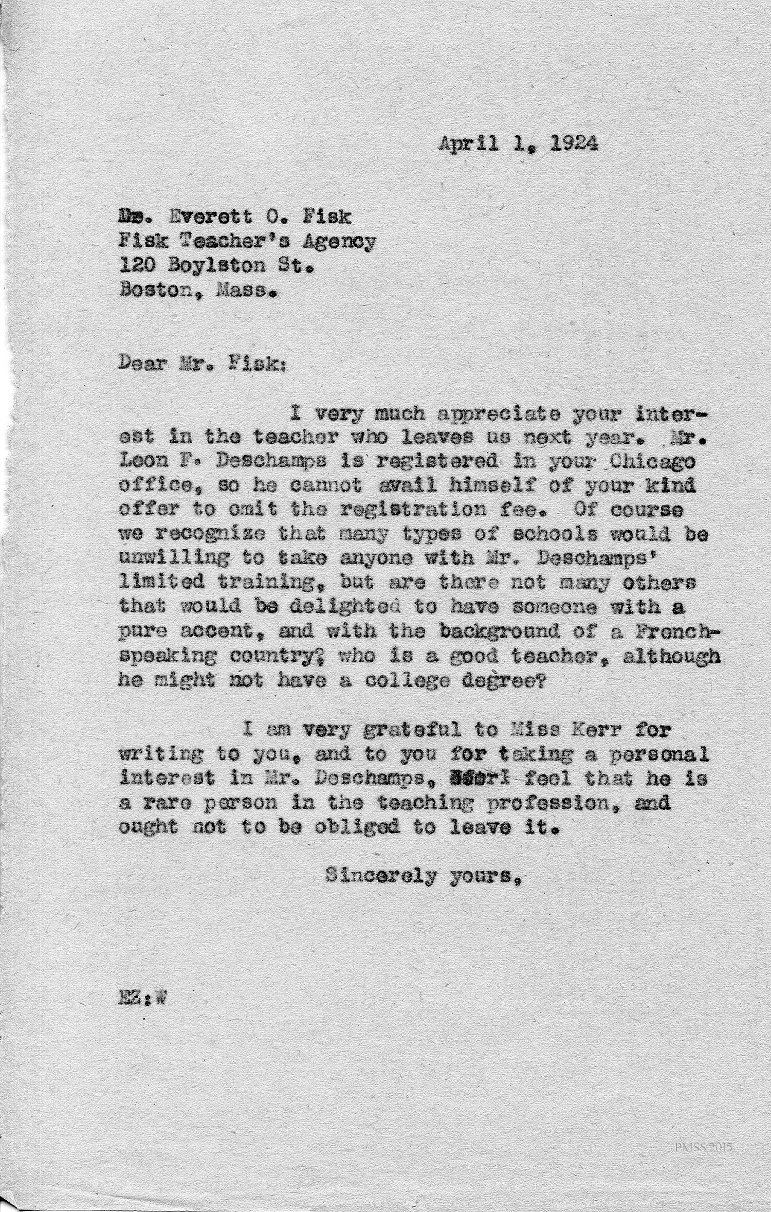 [unsigned] “EZ” (Ethel Zande) to Mr. Everett O. Fisk, Fisk Teachers’ Agency Boston, MA: Appreciates Fisk’s interest in Deschamps.