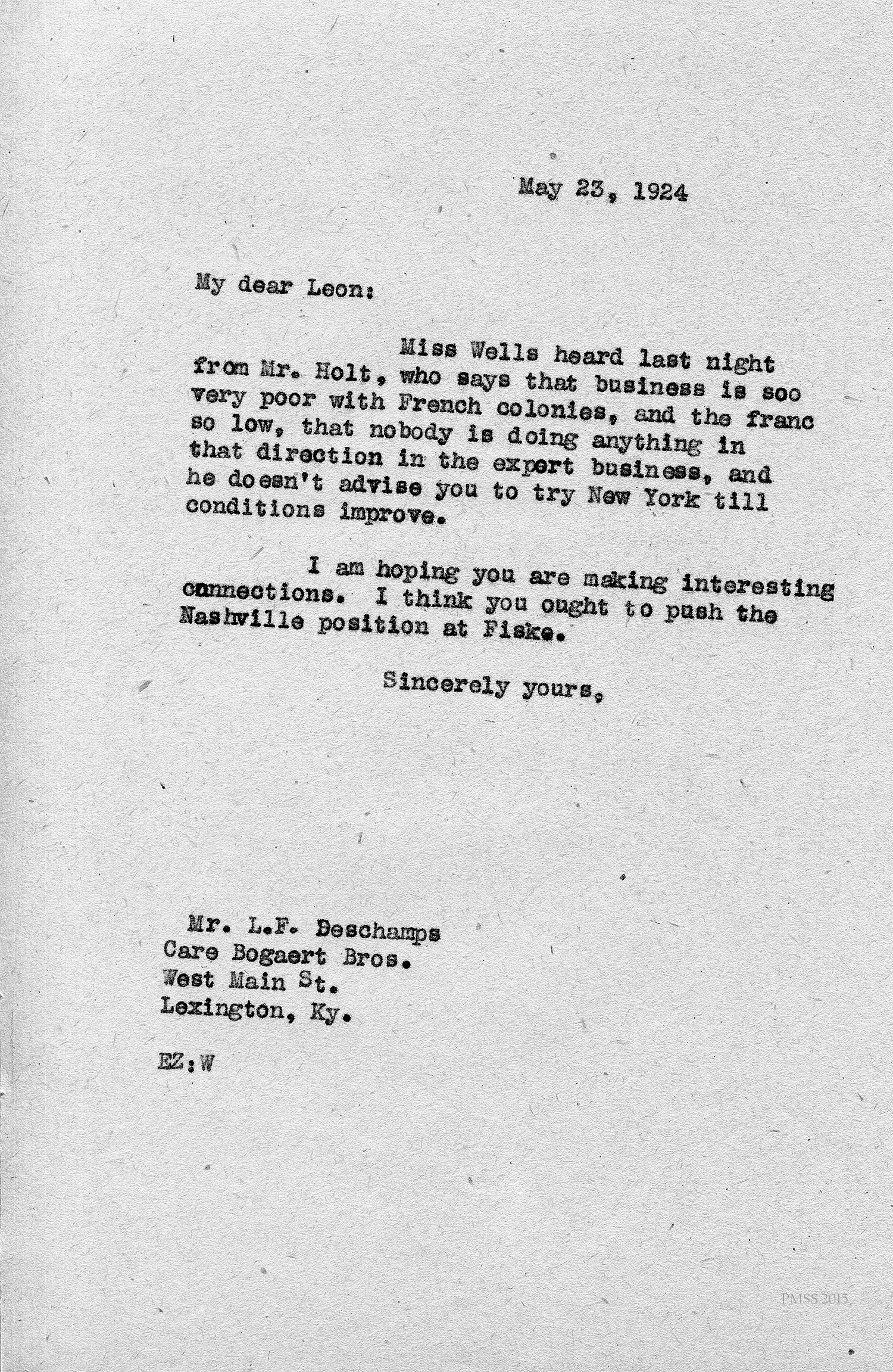 [unsigned] “EZ” (Ethel Zande) to “Leon” (Deschamps), care Bognert Bros., Lexington, KY: Miss Wells heard from Mr. Holt that export business is doing very poorly.