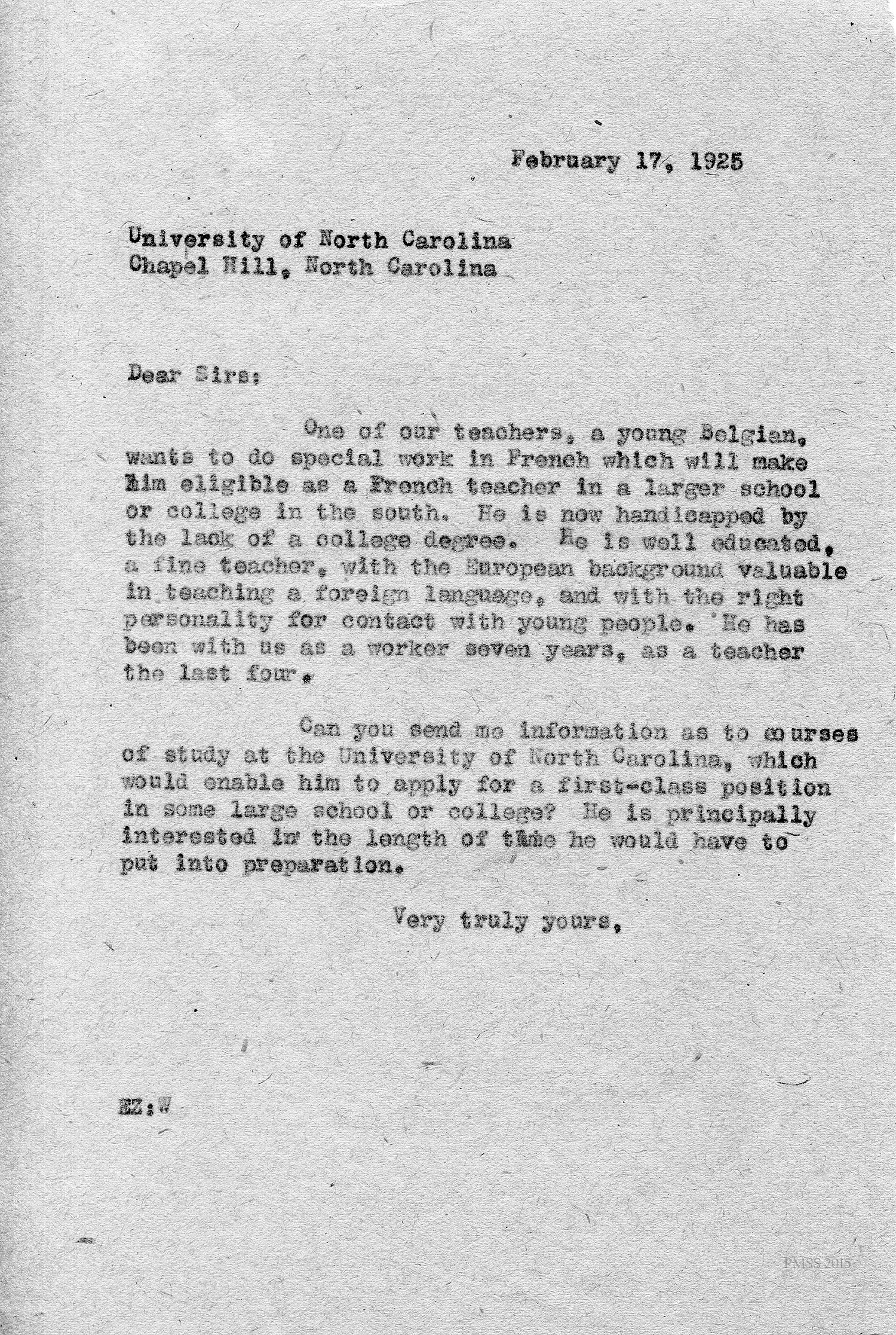 [unsigned] “EZ” (Ethel Zande) to “Sirs” at Univ. of North Carolina at Chapel Hill: Asks for information about courses to study and length of time to get a degree.