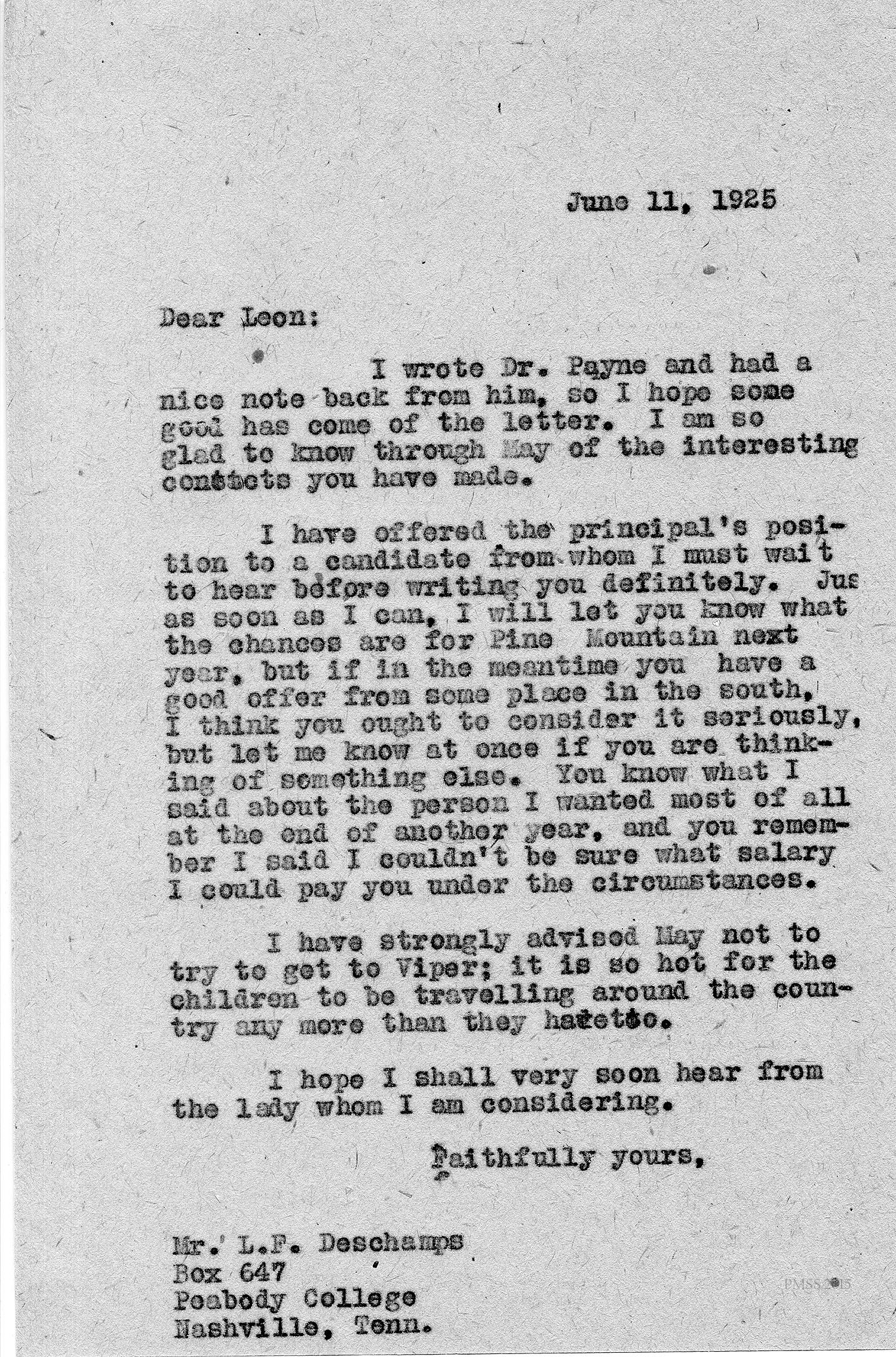 [unsigned, probably Zande] to “Leon” at Peabody College: Informs Deschamps of letter from Peabody College; waiting for answer from candidate for principal’s position.