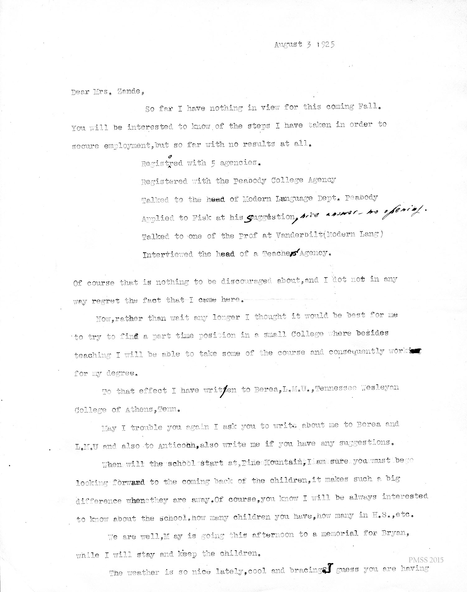 [unsigned] “EZ” (Ethel Zande) to Miss Mina Kerr, Executive Secretary, AAUW, Washington, DC: Asks for suggestions for young man (Deschamps) who has given up forestry and has been teaching French, physics and general science at PMSS; wants to specialize in French, which isn’t needed at PMSS; describes his credentials.