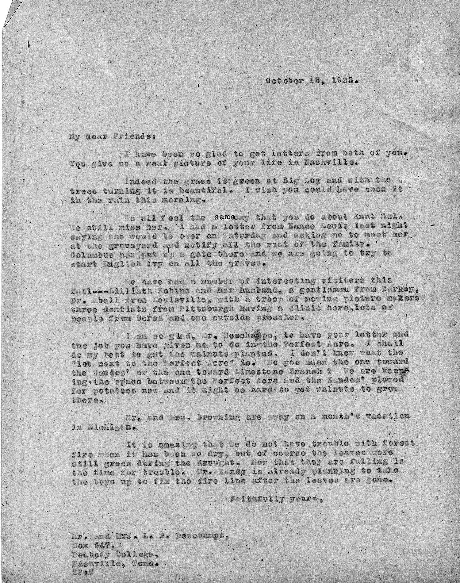 [unsigned] “KP” (Katherine Pettit) to “My dear Friends” (Mr. and Mrs. Deschamps): We still miss Aunt Sal, too; Nance Lewis; graveyard; Columbus (Creech); English ivy; visitors (Liliath Robins and husband, Turkish gentleman, Dr. Abell, moving picture makers, three Pittsburgh dentists, Berea people, preacher); Perfect Acre; walnut trees; Limestone Branch; potatoes; Mr. and Mrs. Browning; forest fire danger; fire line; Mr. Zande.
