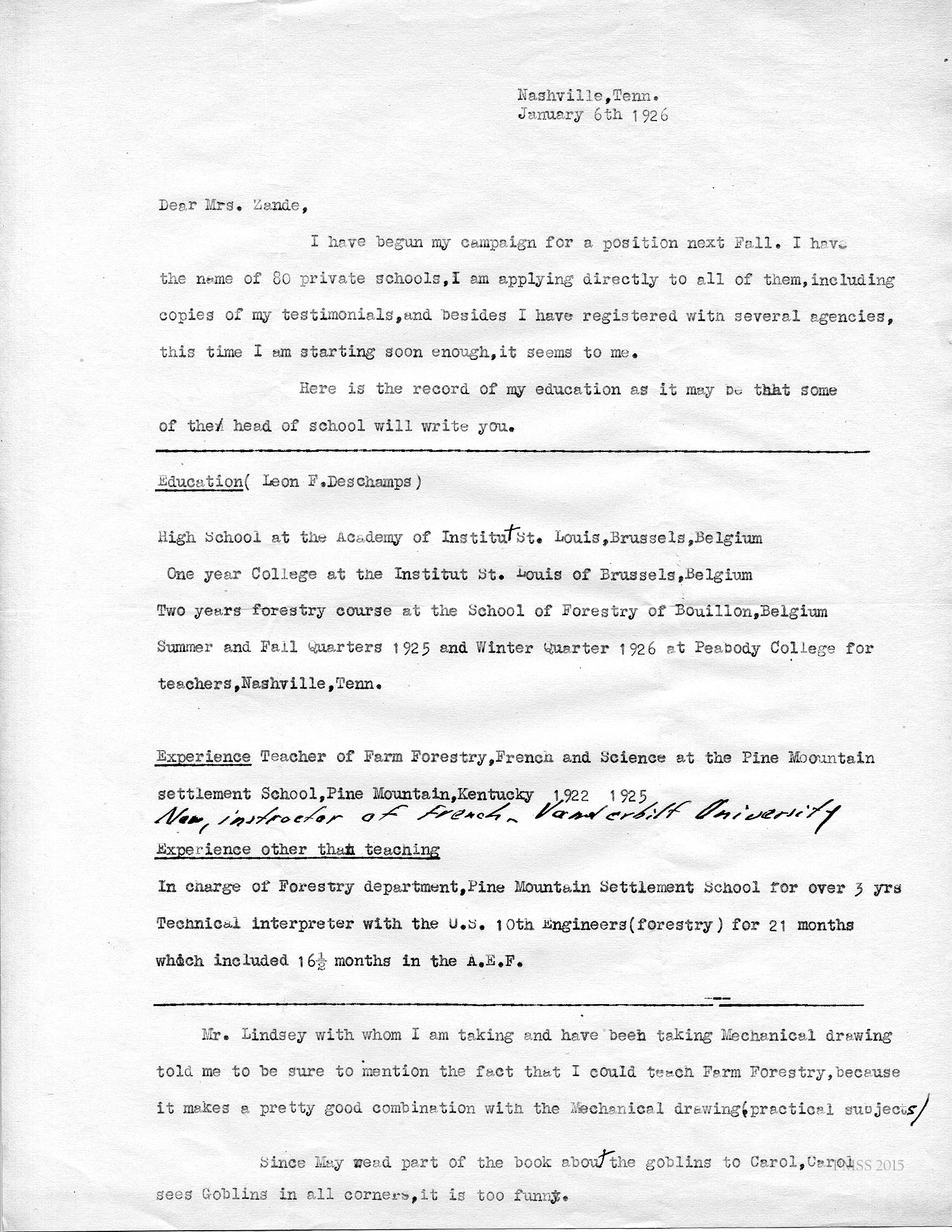 “Leon” (Deschamps) from Peabody College, Nashville, TN, to Zande: Will work for a degree and stay in teaching: Still interested in staying at Pine Mt.