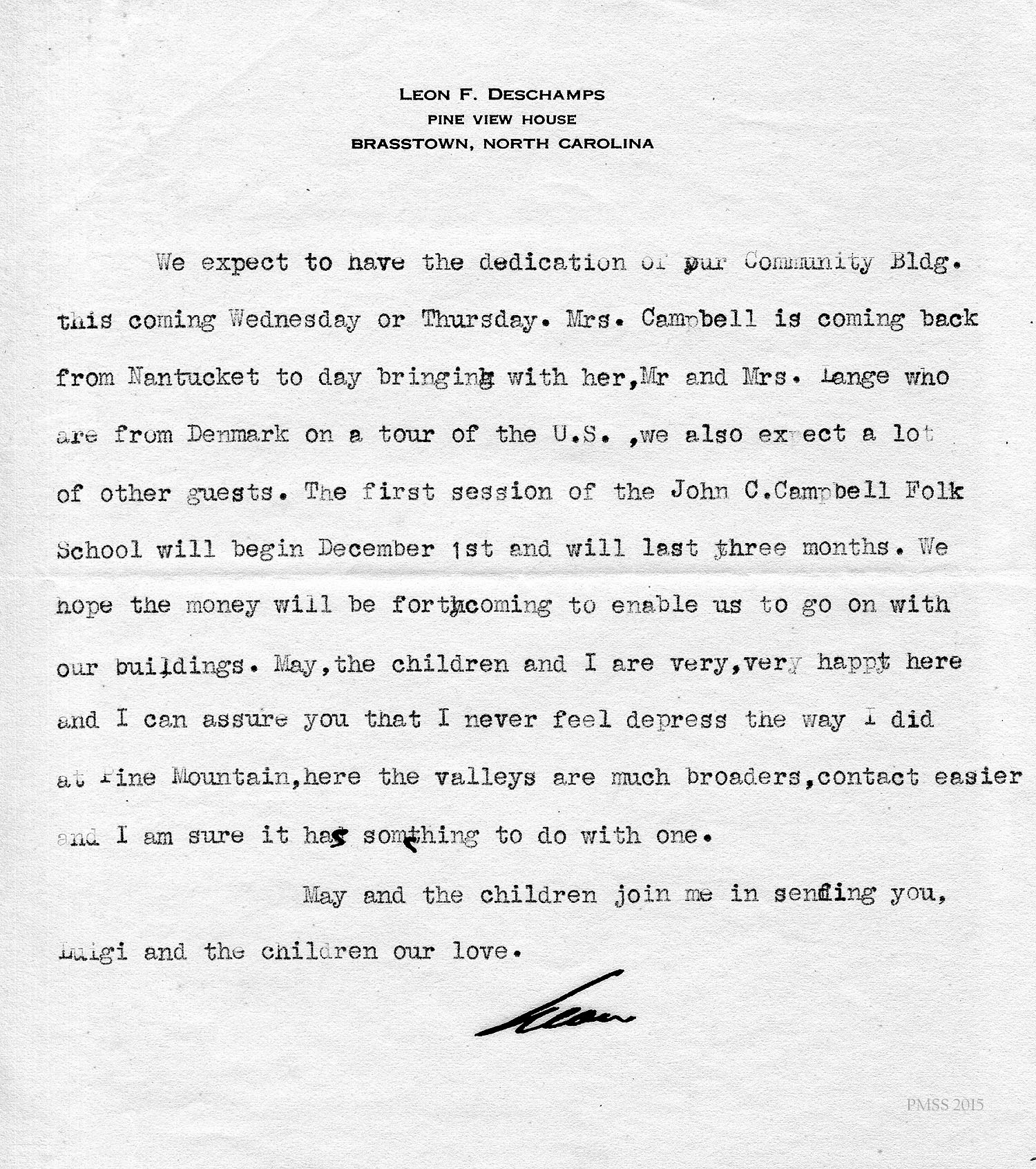 Deschamps in Brasstown, NC [no salutation]: community building; Mrs. Campbell; Mr. and Mrs. Lange; John C. Campbell Folk School.