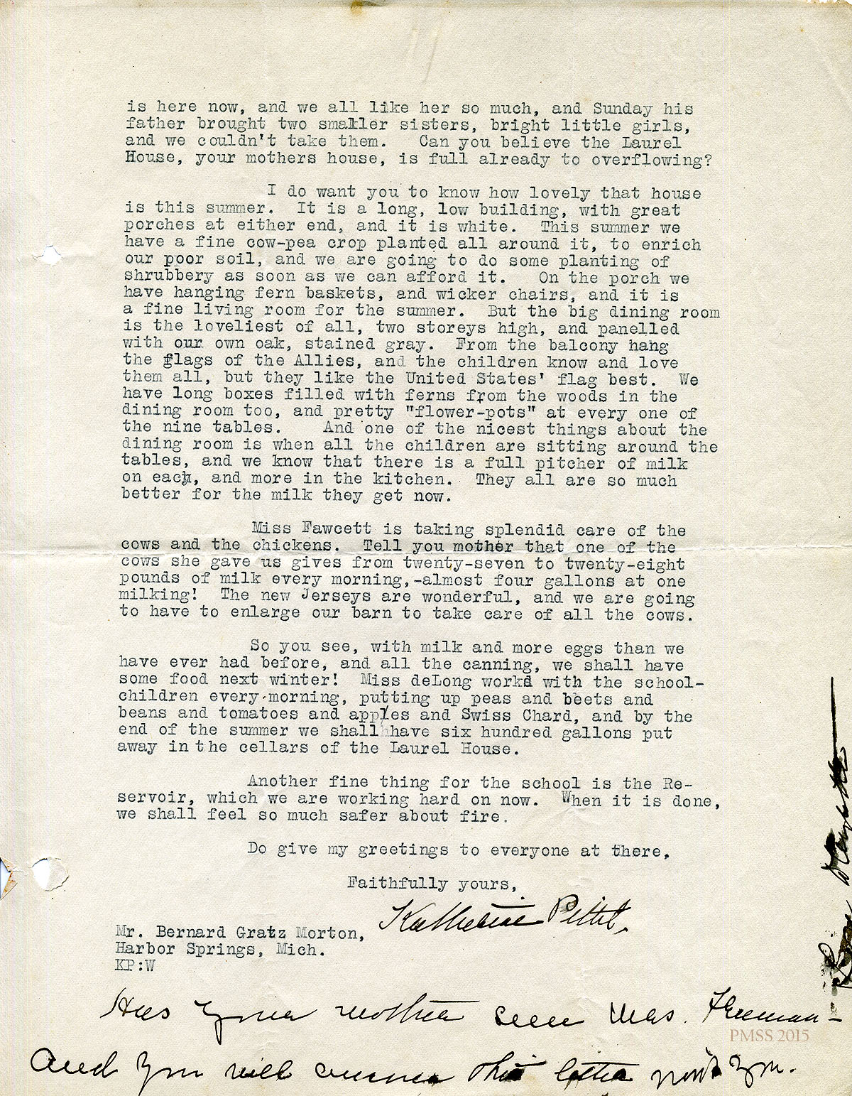 August 21, 1917 [2 pages]. Katherine Pettit to “Buddie” (Mr. Bernard Gratz Norton), Harbor Springs, MI. Reminiscences about her summer visit to Michigan; fundraising for the road; donations by Harlan mine operators; progress of schoolhouse; Laurel House; Miss Fawcett’s work with chickens and cows; canning; reservoir. Handwritten notation on second page: “Has your mother seen Mrs. Freeman – [?indecipherable]” [007-008]