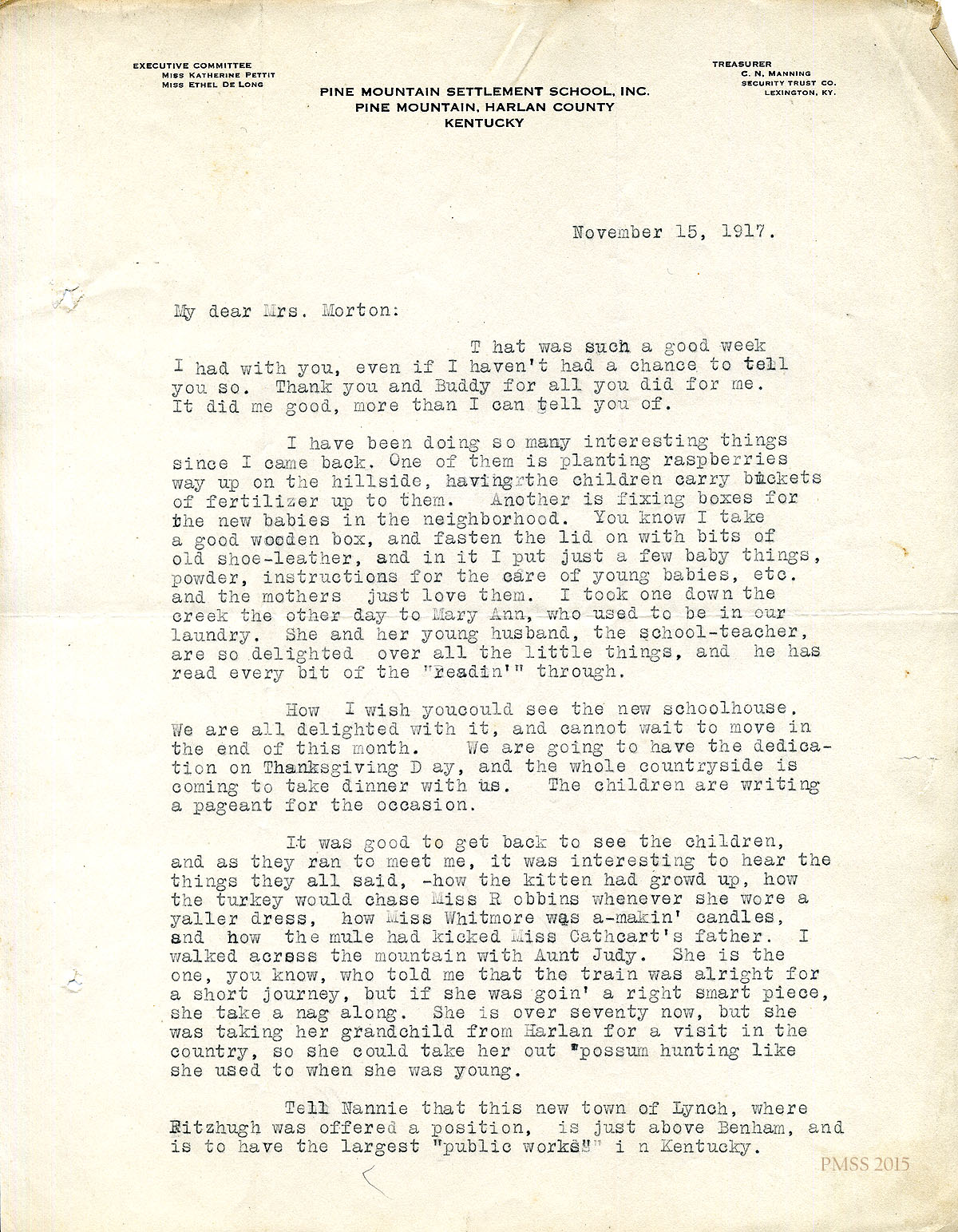 November 15, 1917 [2 pages]. Katherine Pettit to Mrs. J.R. Norton, Lexington, KY. Thanks Mrs. Norton for her week’s stay; planting raspberries; making gift boxes for new babies; moving to new schoolhouse in December; children anecdotes; new town of Lynch; Catholic School in Corbin. Handwritten notation on second page: “Love to you & Buddie & Mannie.” [009-010]