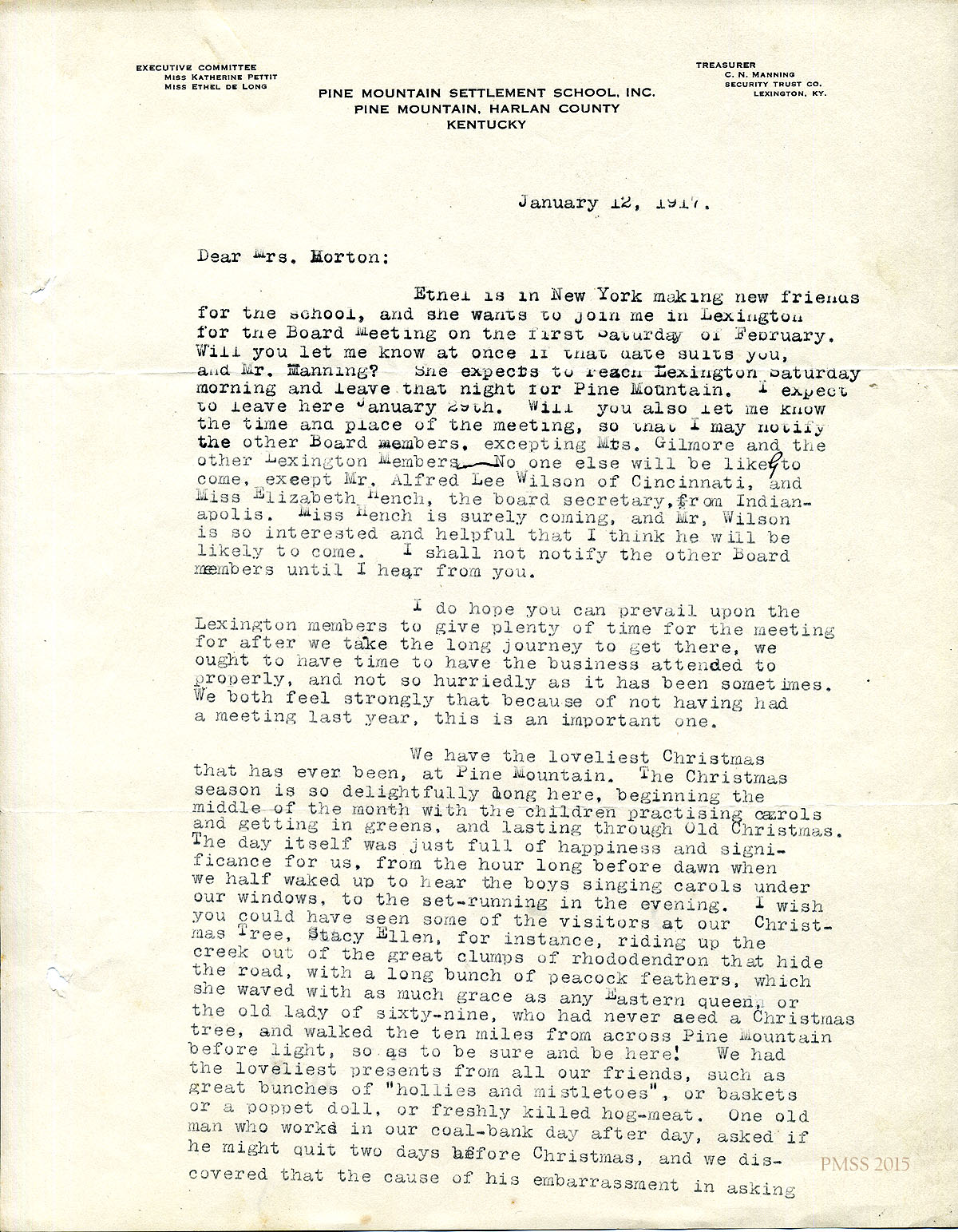 January 12, 1917 [2 pages]. [Unsigned] KP to Mrs. J. R. Morton, Lexington, KY. Arranges for board meeting in Lexington; describes Christmas at Pine Mt.; Mr. Deschamps’ work in P.M. forest, teaching, and growing perfect acre; anecdotes about the children. [002-003]
