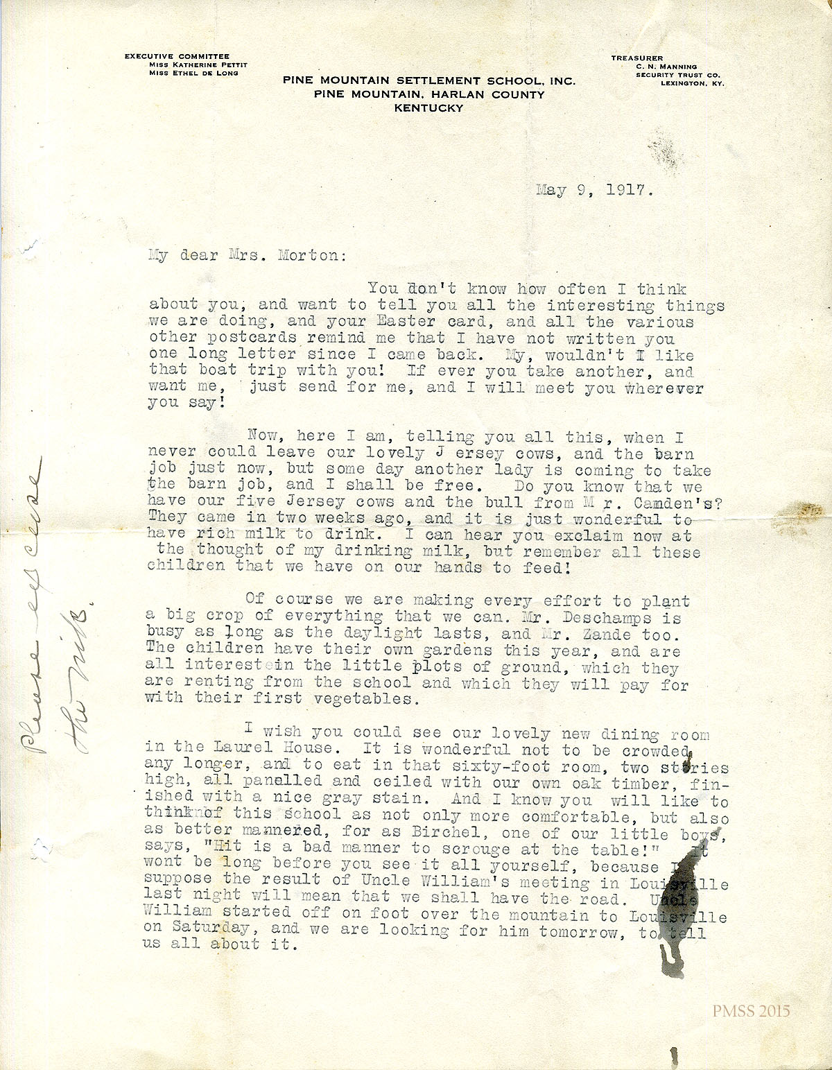 May 9, 1917 [2 pages]. Katherine Pettit to Mrs. J. R. Morton, Lexington, KY. Tells about her barn job and cows; planting crops by Mr. Deschamps, Mr. Zande and the children ; new Laurel House dining room; Uncle William’s meeting in Louisville concerning the road; visiting photographers, including Mr. Sumner Appleton of Boston, connected with Society for the Preservation of New England Antiquities.