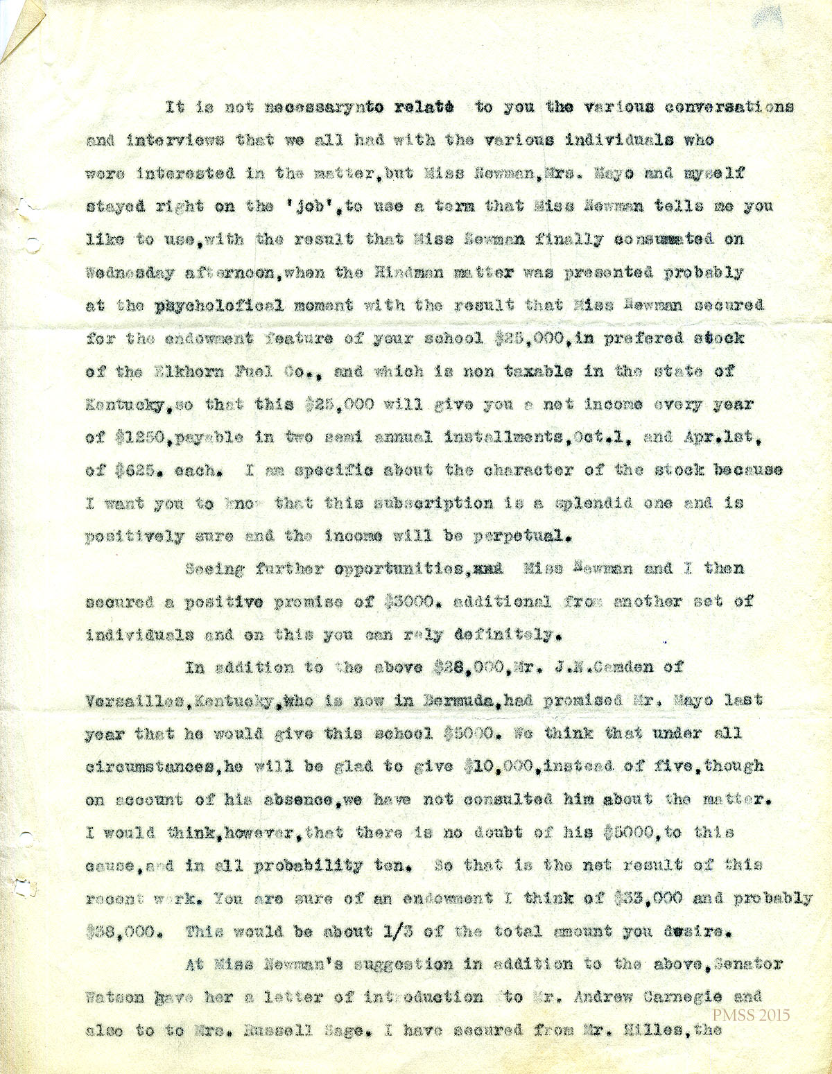 [019-022] [n.d., 1911?] Typewritten copy of letter from C. B. [Bascom] Slemp*, House of Representatives, U.S. Committee on Expenditures in the Postoffice Dept, Washington, DC, to Miss Pettit, Lexington, KY. Miss [Eve] Newman’s visit; names of his contacts who will help with school land and endowment.