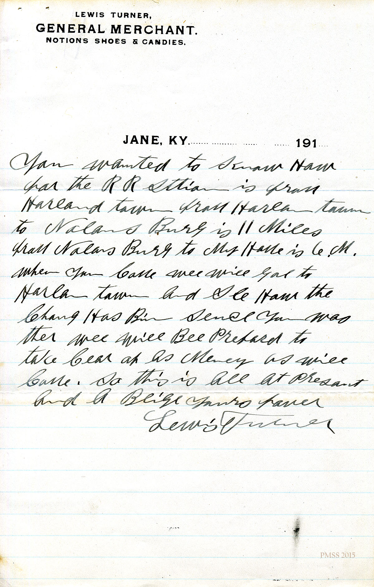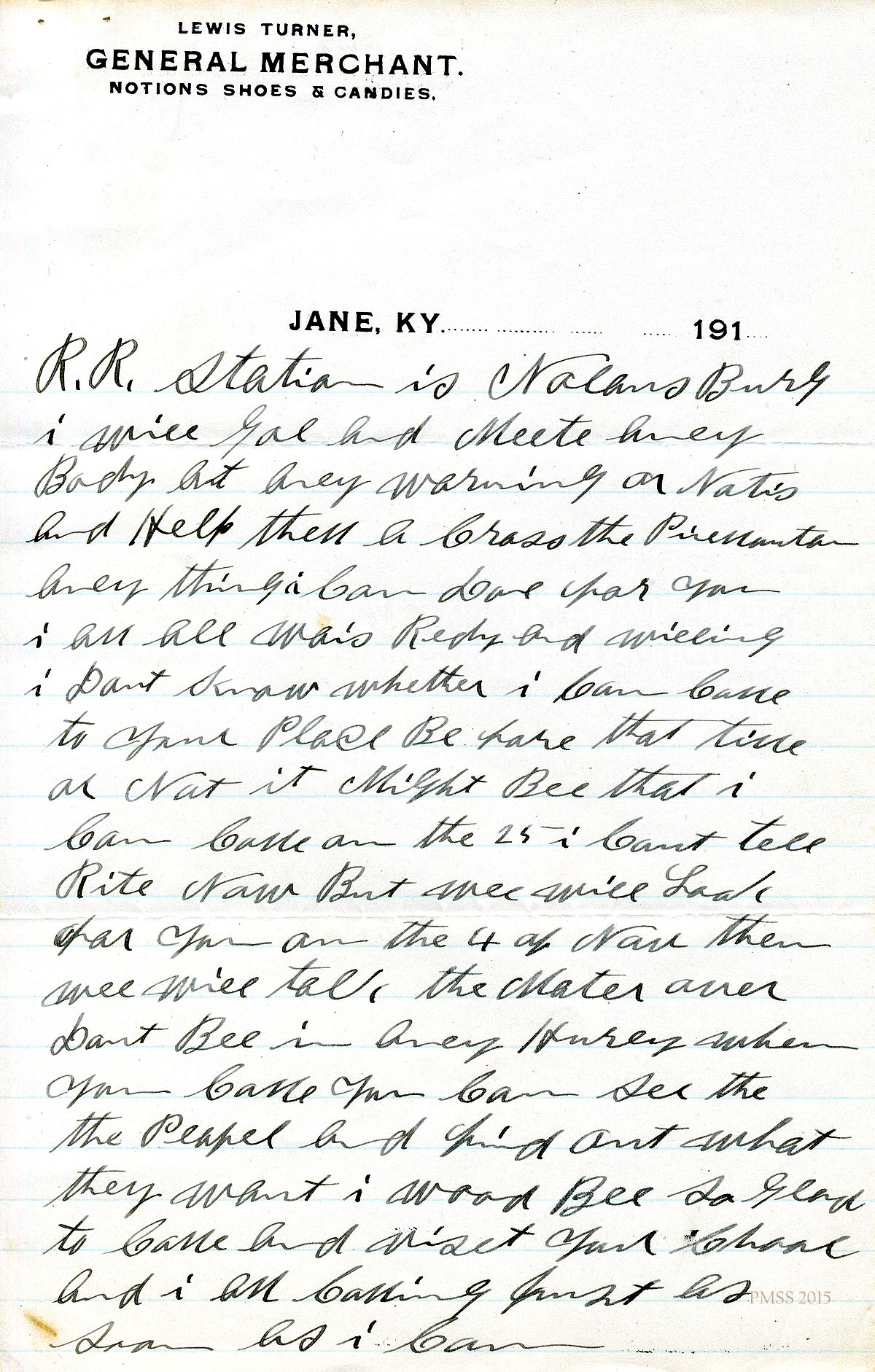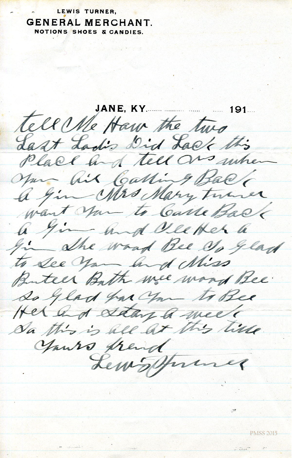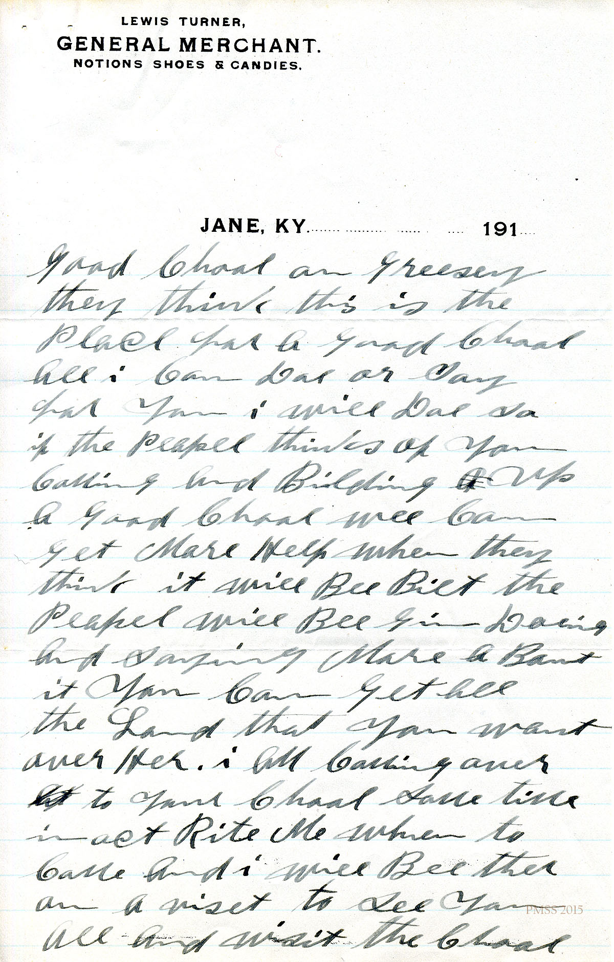 [001-003] August 2, 1911. Handwritten by Lewis Turner, General Merchant, “Notions, Shoes & Candies”, Jane, KY to Miss Pettit, Hindman, KY. Why the people want Pettit to create a good school; invites Pettit to return.