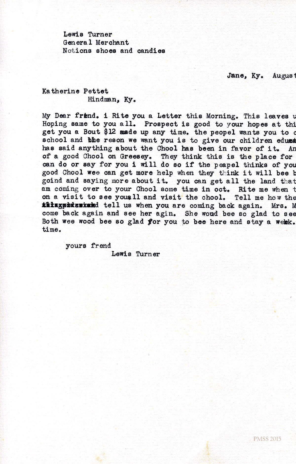 [004] August [date truncated]. Typewritten transcription of letter [001-003] from Lewis Turner, Jane, KY, to Miss Pettit, Hindman, KY.