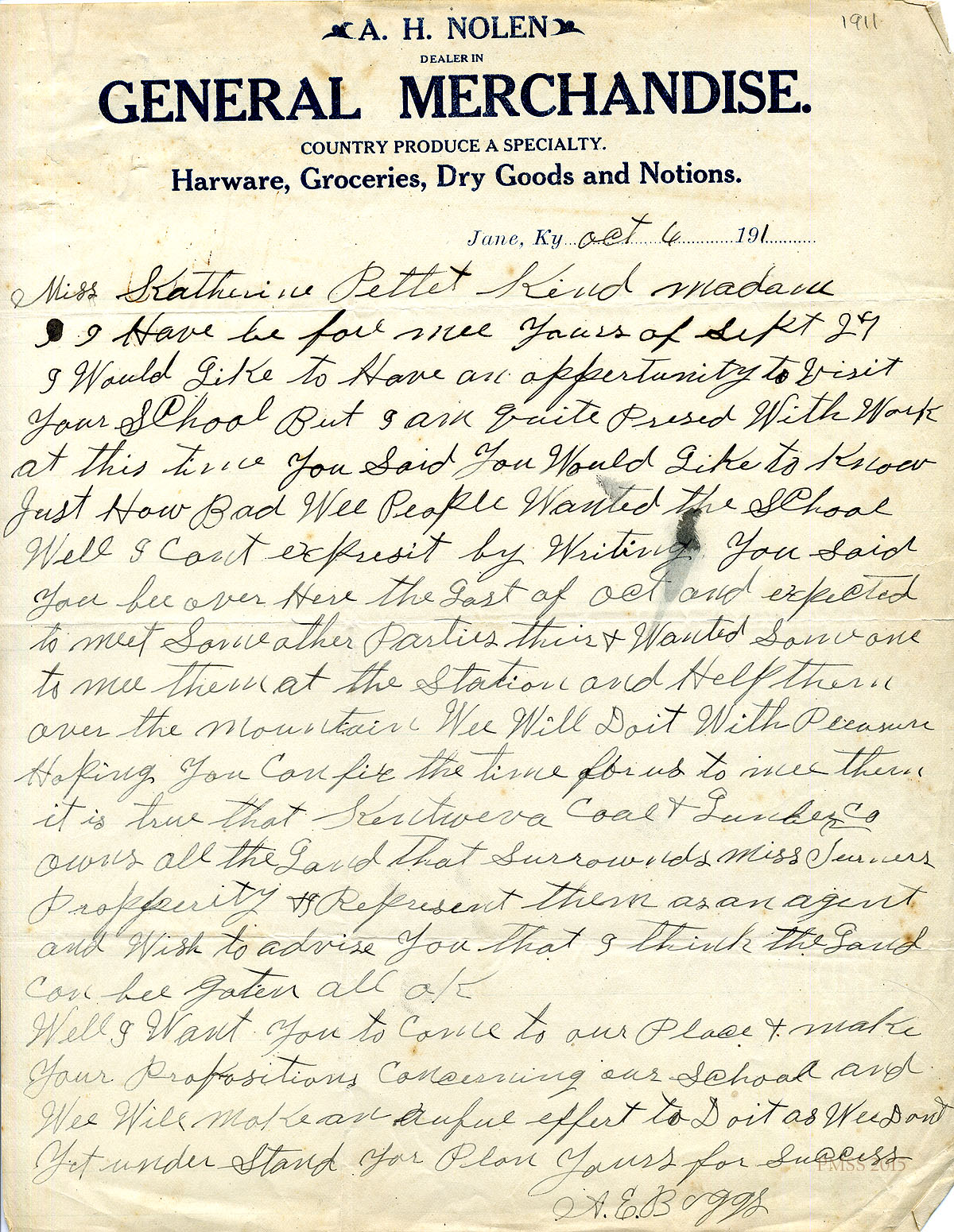 [006] October 6, 1911. Handwritten by A.E. Boggs, Jane, KY, on letterhead for “A.H. Nolen, Dealer in General Merchandise” to Miss Pettit. To meet with Pettit to promote new school; purchasing land from Kentweva Coal & Lumber Co.