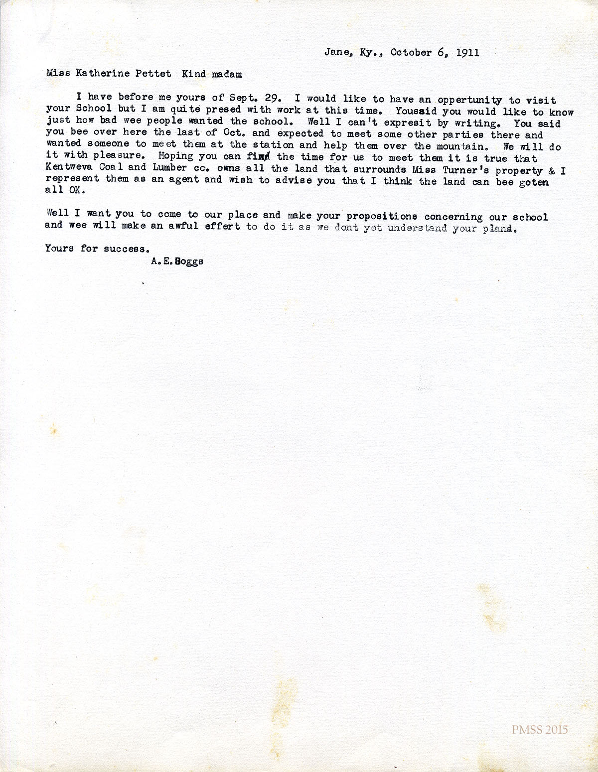 [007] October 6, 1911. Typewritten transcription of letter [006] from A.E. Boggs, Jane, KY, to Miss Pettit, Hindman, KY.