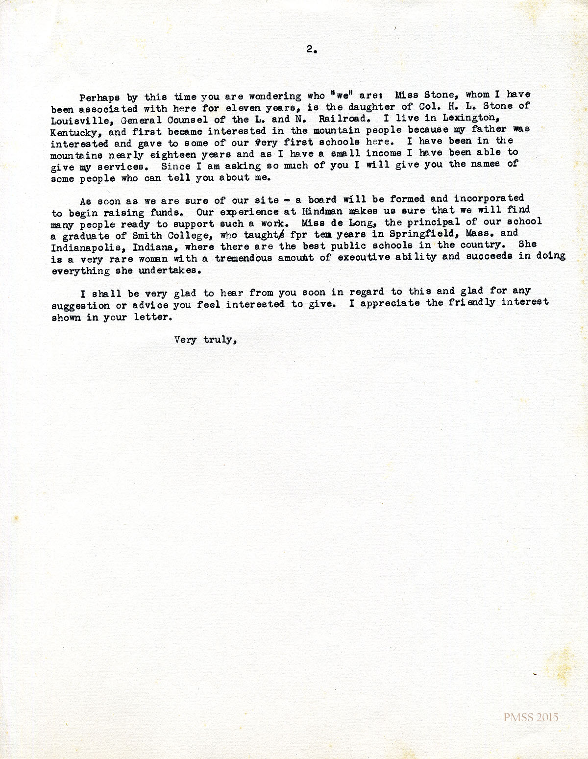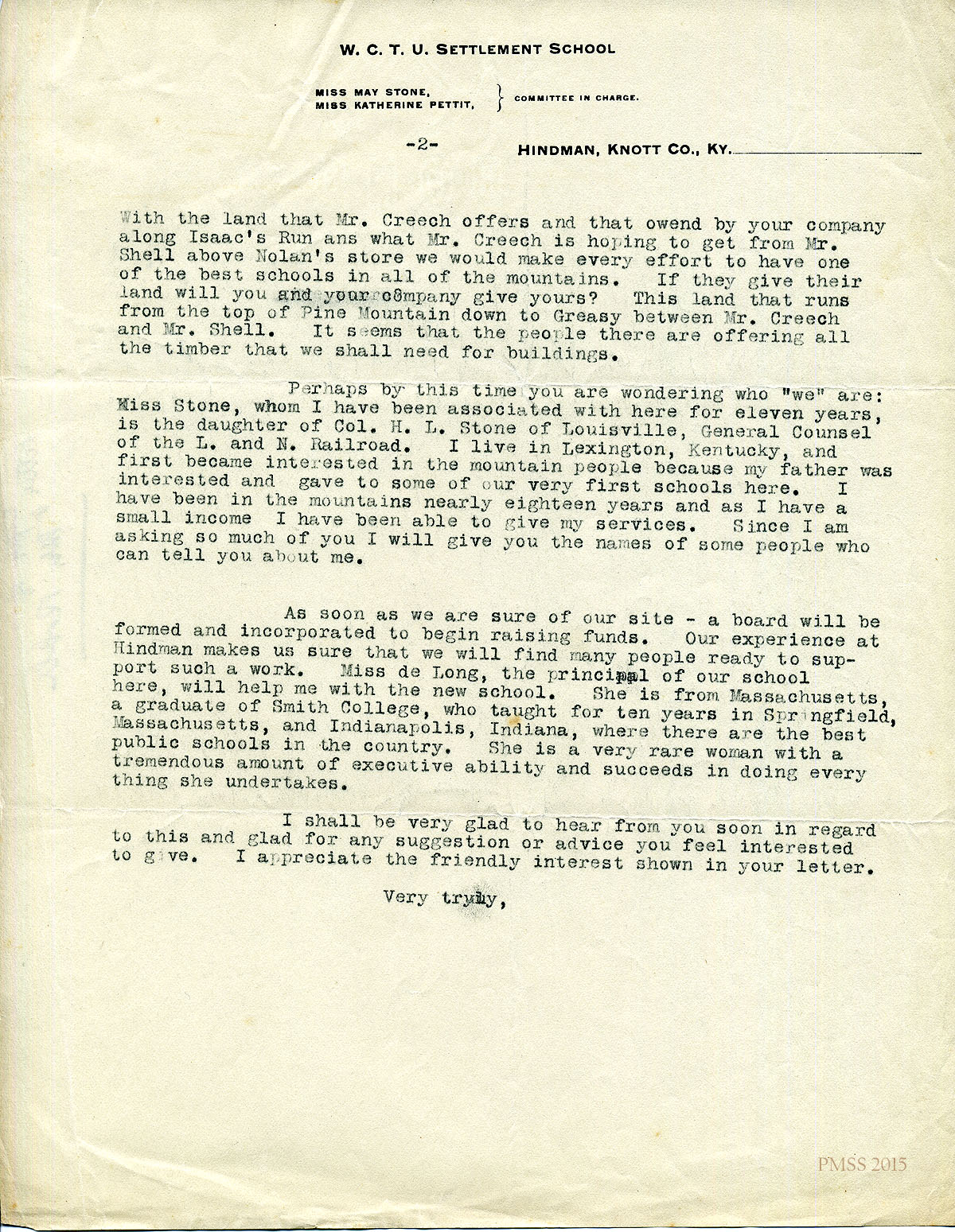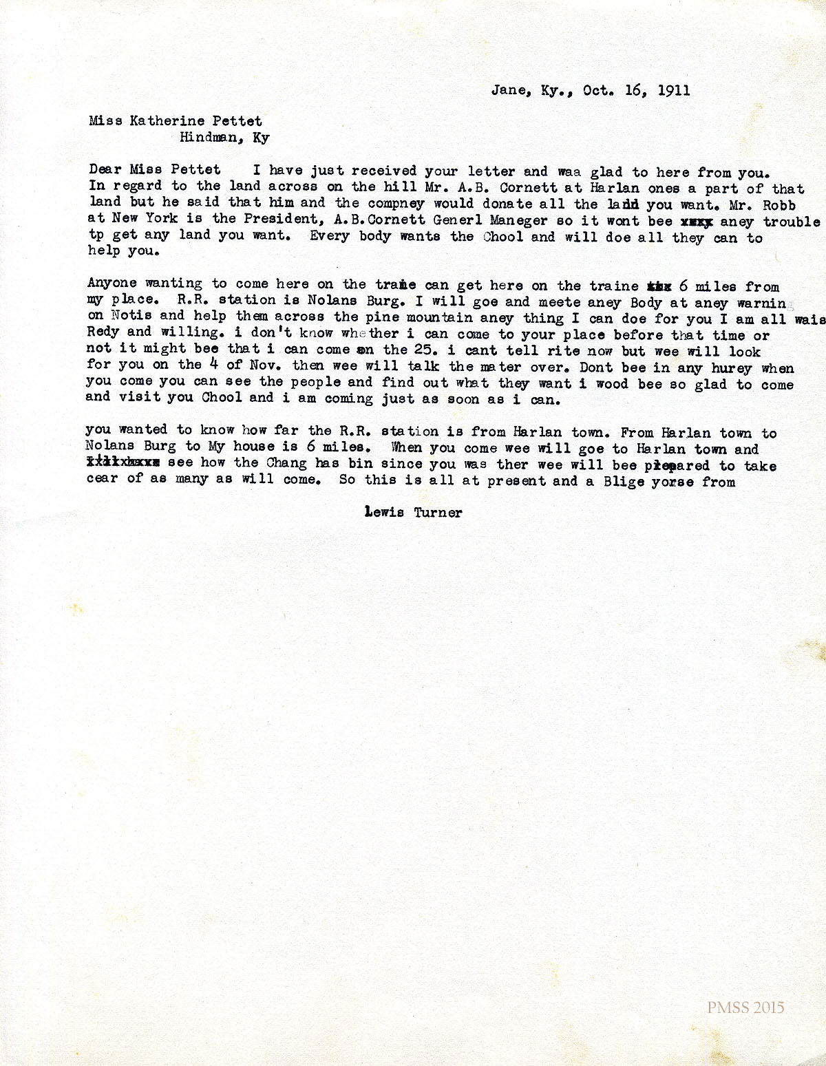 TAGS: Katherine Pettit ; Ethel de Long (Zande) ; Lewis Lyttle ; Lewis Turner ; general merchants ; Jane, KY ; Hindman, KY ; A.E. Boggs ; Kentweva Coal & Lumber Co. ; land donations ; Turner Family ; Charles S. Robb ; railroads ; WCTU Settlement School ; Miss May Stone ; C. Bascom Slemp ; Miss Eve Newman ; endowment ;