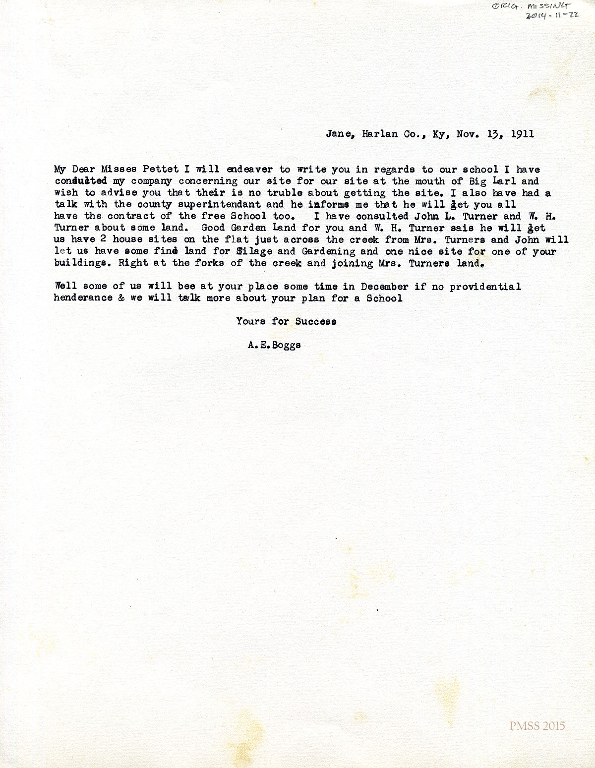 [012] November 13, 1911. Typewritten transcription of [missing] letter from A.E. Boggs, Jane, KY, to Miss Pettit, Hindman, KY. Land at Big Laurel to be donated by his company and the Turners.
