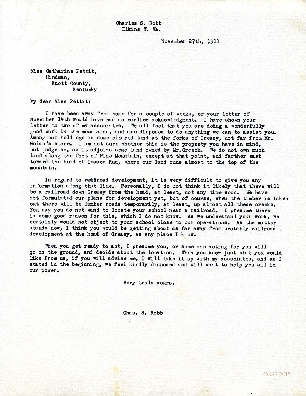 [013] November 27, 1911. Typewritten letter signed by Charles S. Robb, Elkins, W.Va., to Miss Pettit, Hindman, KY. Available land for school; railroad development.