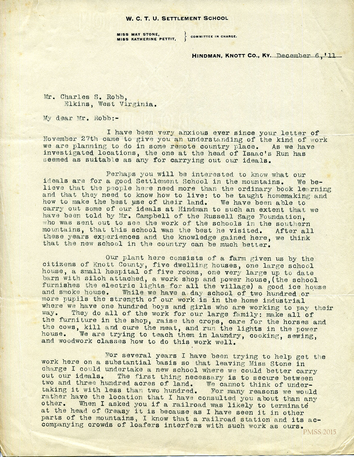 [015-016] December 6, 1911. [unsigned]. Possibly Miss Pettit on “WCTU Settlement School, Hindman, KY” letterhead to Charles S. Robb, Elkins, W.Va. Her ideals for building a settlement school in the mts; description of Hindman; land donations; info about Misses Stone, de Long, and Pettit.