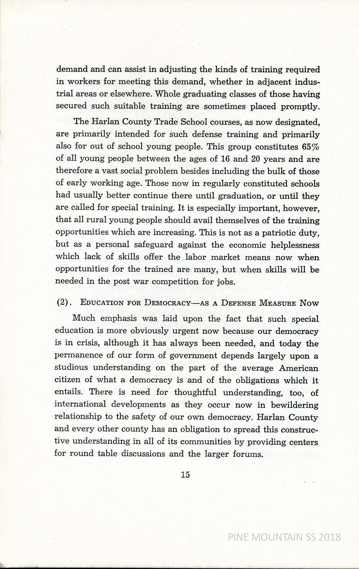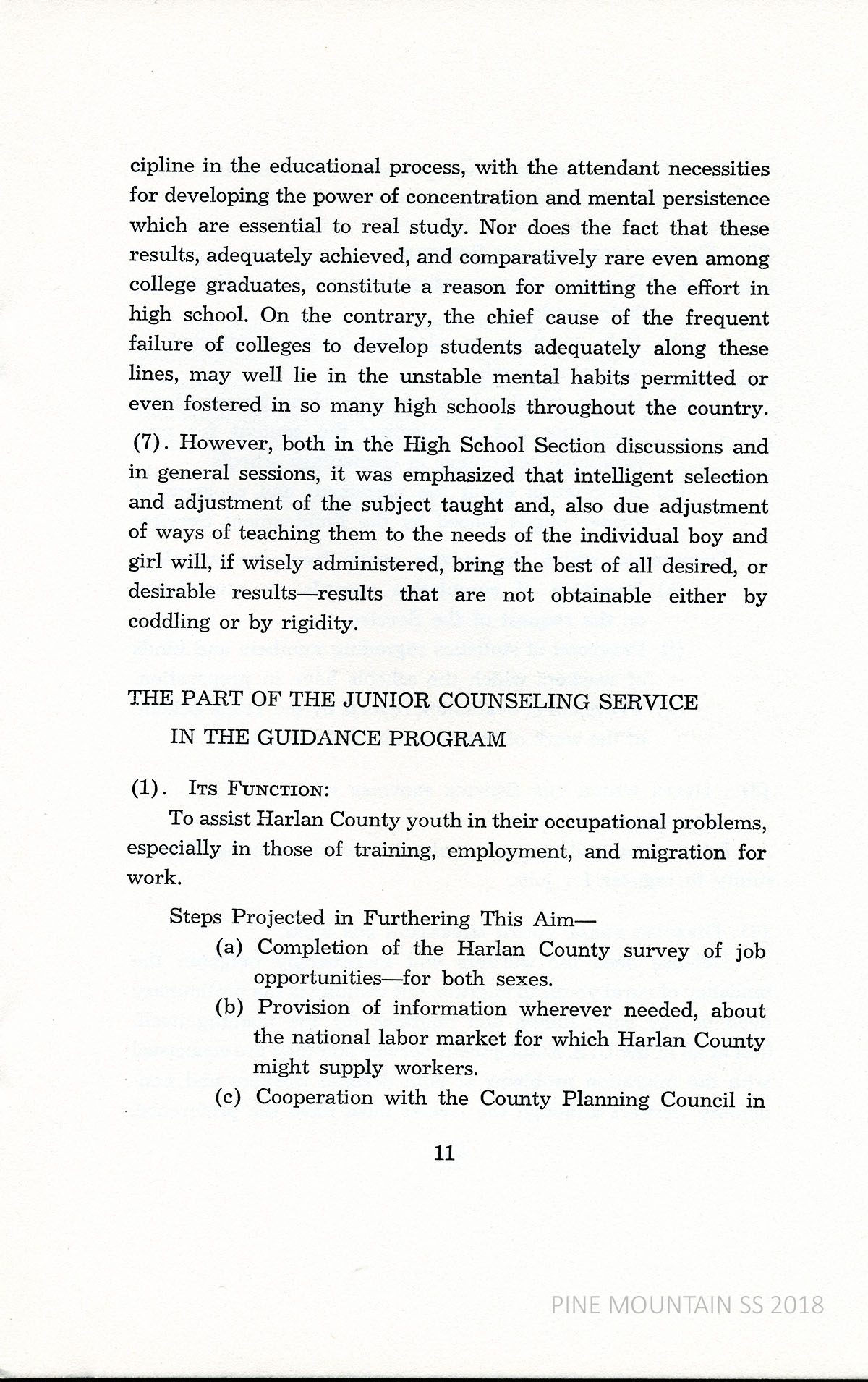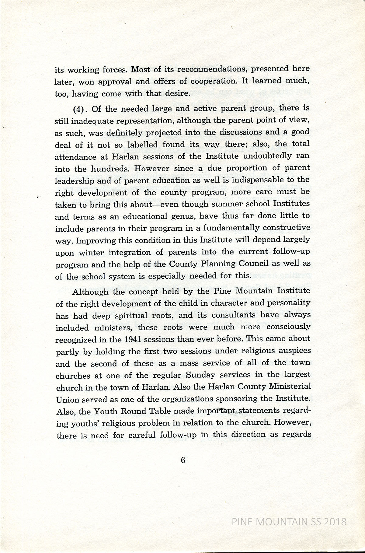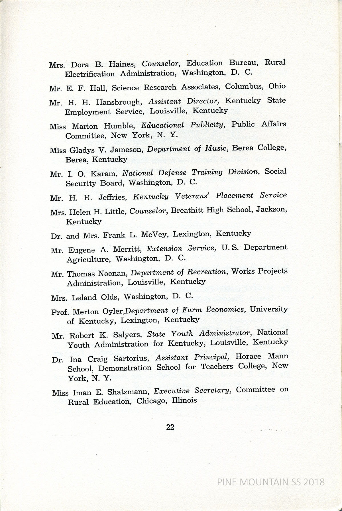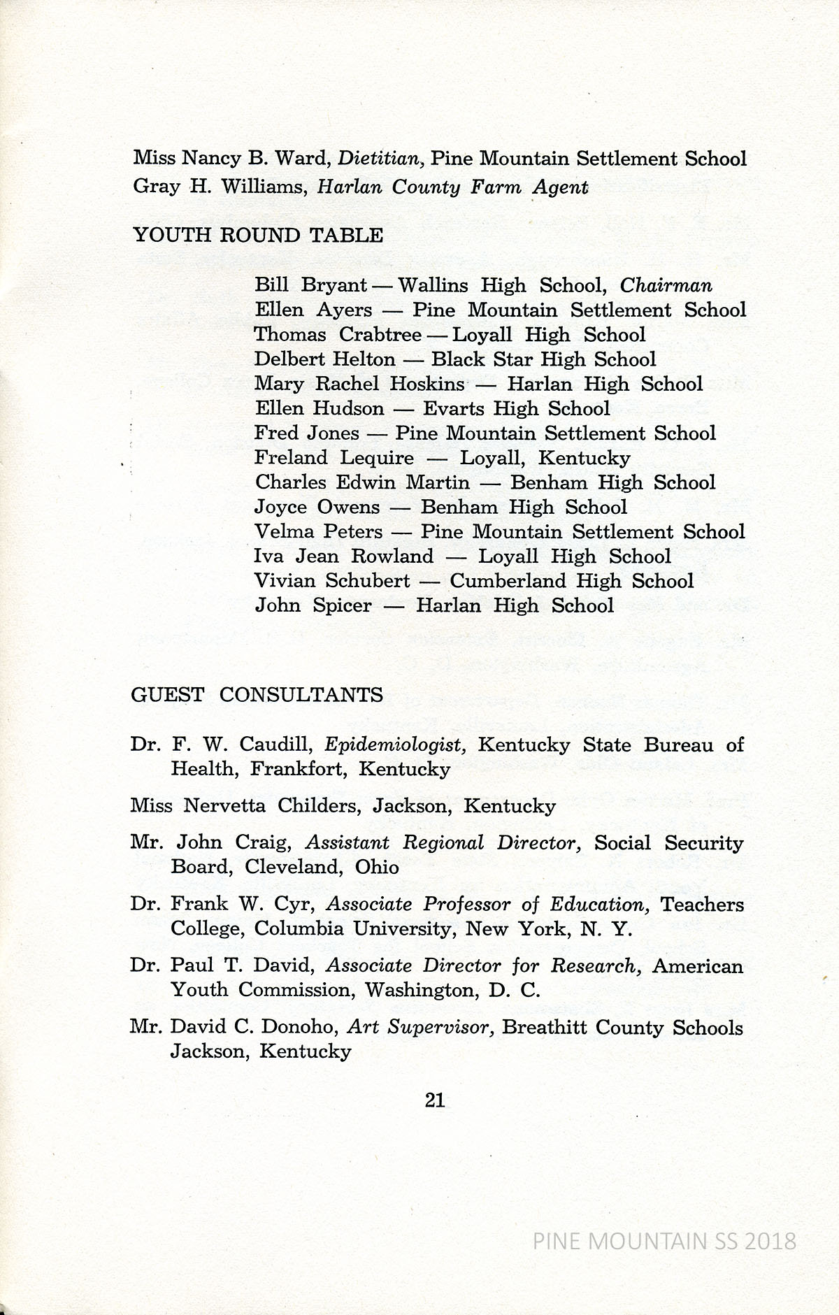 In 1941 the Harlan Daily Enterprise noted that “more than three hundred Harlan county teachers, parents, ministers and other youth leaders, have been meeting during the entire week of May 25-31 at the Fifth Pine Mountain Guidance Institute, sponsored by the Alliance for Guidance for Rural Youth of Richmond, Virginia at Pine Mountain Settlement School.