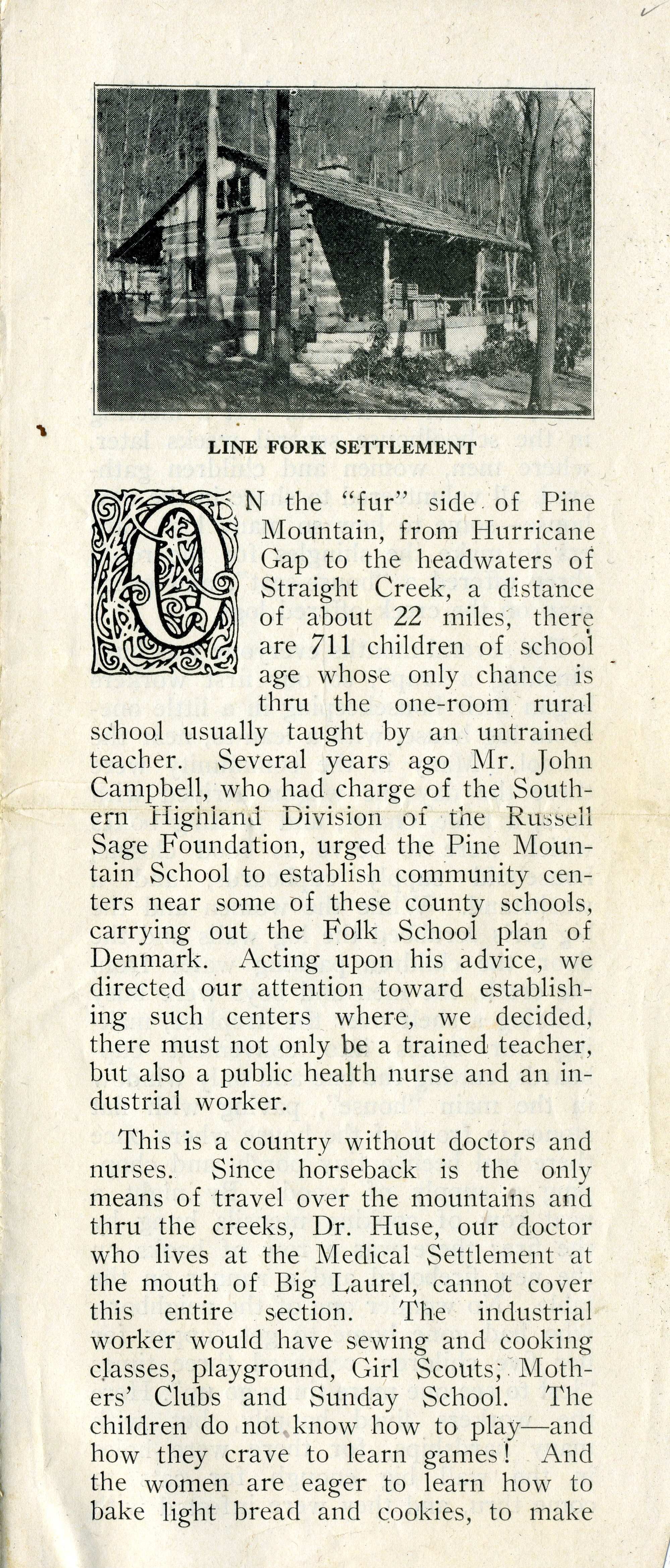 The history of the extension center at Line Fork is both rich and deep and many of the records have survived over time. The extension initiative is described in a promotional flyer [see below] written for potential donors during the beginning years of the settlement extension. The brochure describes some of the plans proposed by Katherine Pettit and Ethel de Long for the satellite settlements that would support Pine Mountain’s programs.