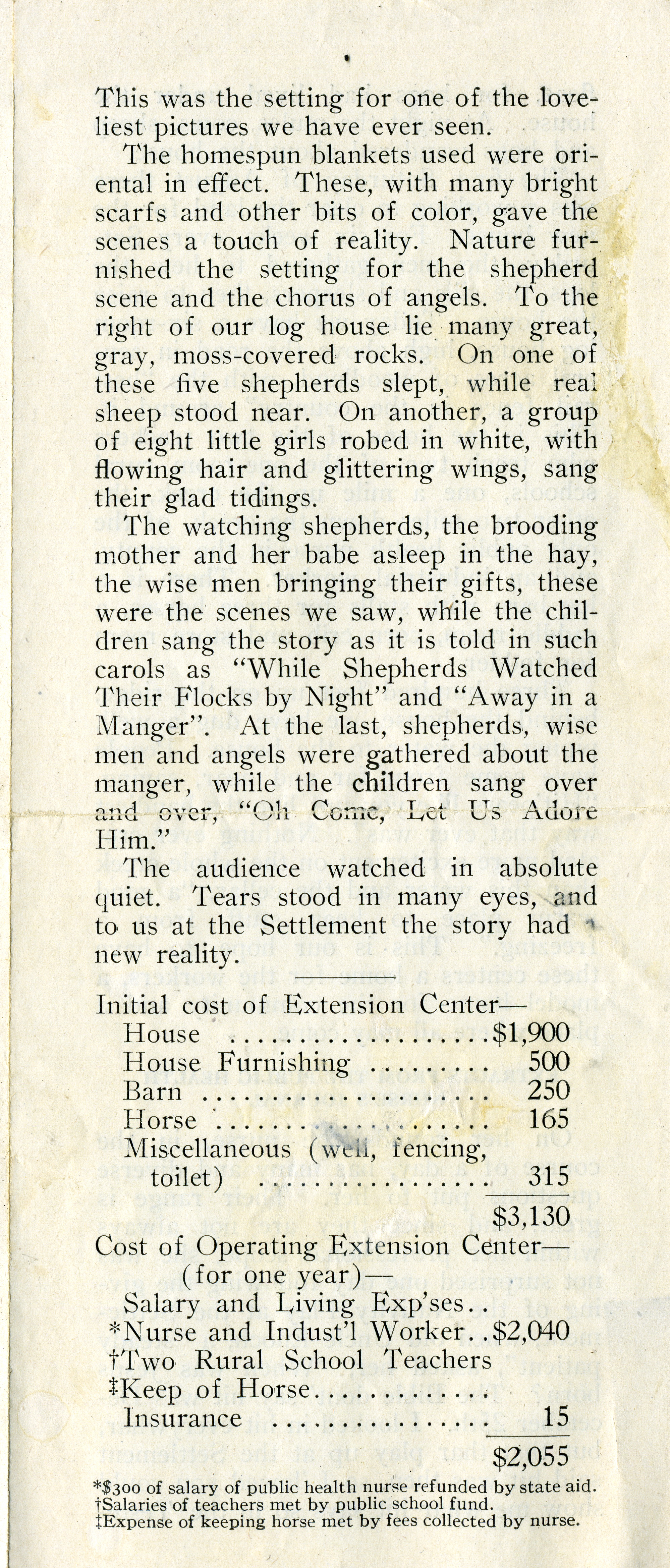 It has been found so hard by Pine Mountain to get the right type of worker to live in an extension center, and to raise funds for its up-keep, that the ideal we had in 1918, five centers in ten years, has not come to pass, though people on Cutshin have asked for workers, and Mr. William Creech has offered us his property on Gabes Branch.
