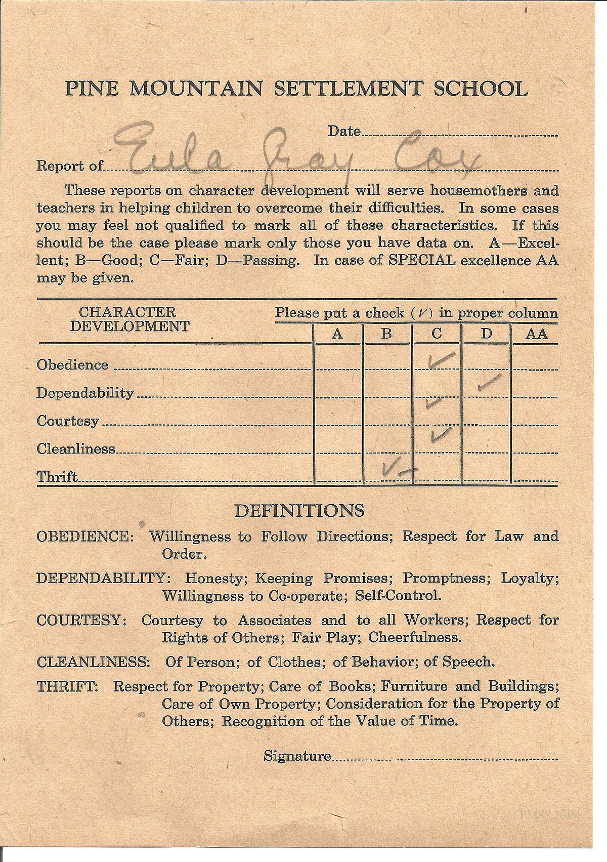 [Checkmarks were entered for Obedience (C), Dependability (D), Courtesy (C), Cleanliness (C), Thrift (B).]