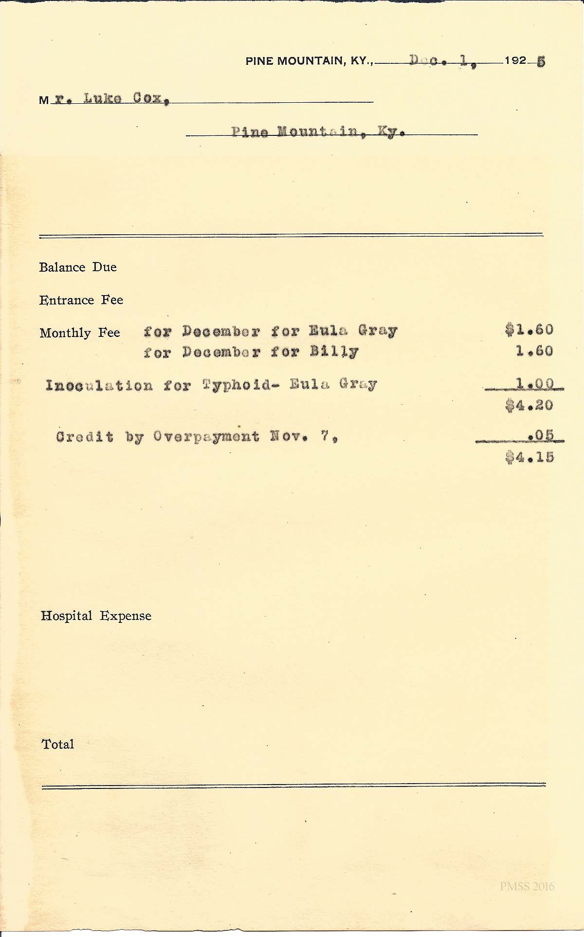 [cox_e_0016.jpg] PMSS tuition bill with carbon copy of typewritten entries for “Eula Gray” and “William.” Dated Dec. 1, 1926.
