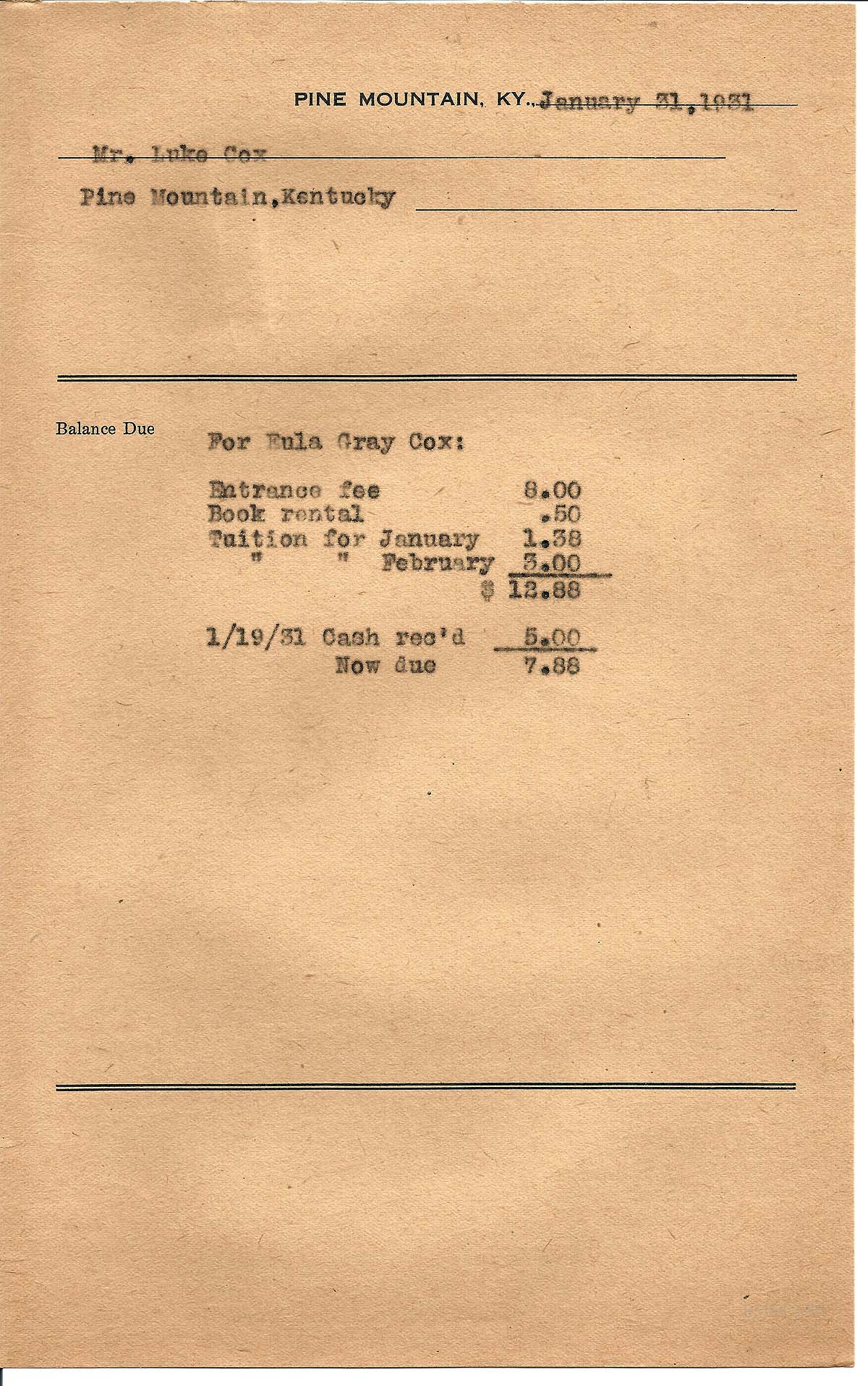 [cox_e_0024.jpg] PMSS tuition, entrance fee, & book rental bill with carbon copy of typewritten entries for “Eula Gray Cox.” Dated January 31, 1931.