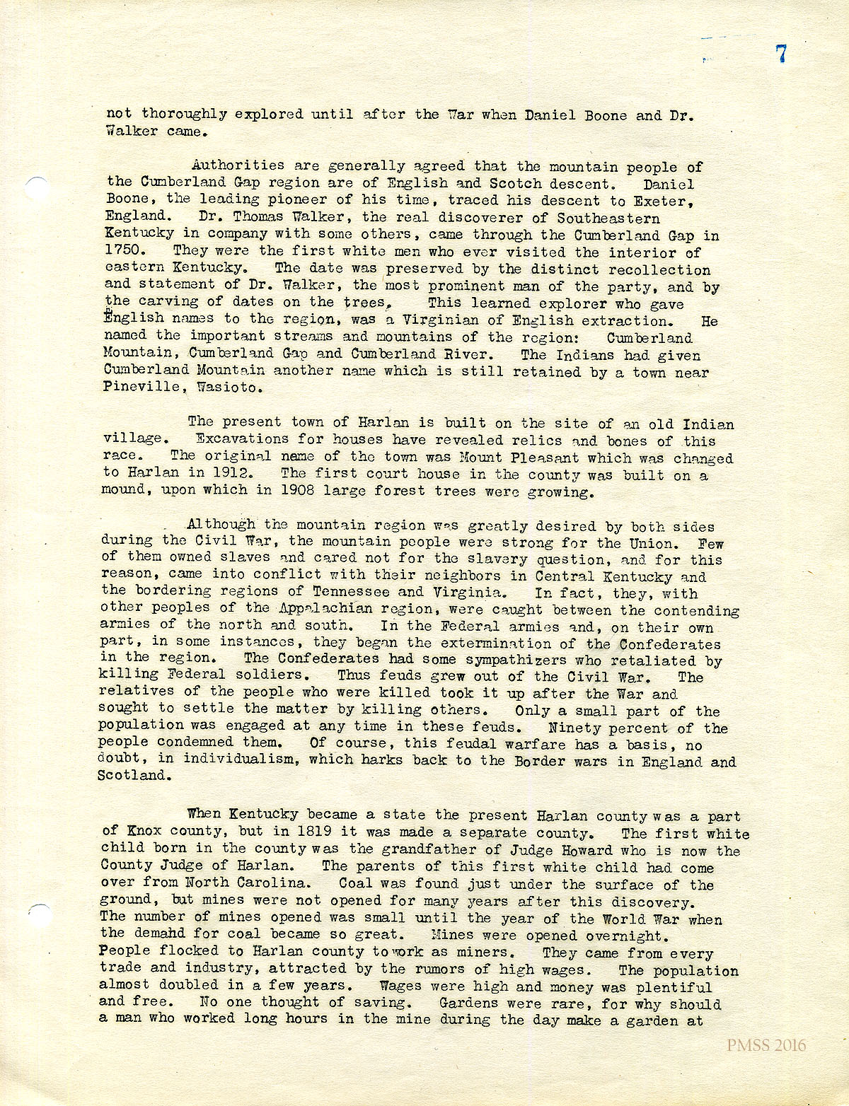 When Kentucky became a state the present Harlan county was a part of Knox County, but in 1819 it was made a separate county. The first white child born in the county was the grandfather of Judge Howard who is now the County Judge of Harlan. The parents of the first white child had come over from North Carolina. Coal was found just under the surface of the ground, but mines were not opened for many years after this discovery. The number of mines opened was small until the year of the World War when the demand for coal became so great. Mines were opened overnight. People flocked to Harlan county to work as miners. They came from every trade and industry, attracted by the rumors of high wages. The population almost doubled in a few years. Wages were high and money was plentiful and free. No one thought of saving. Gardens were rare, for why should a man who worked long hours in the mine during the day make a garden at [page 08] at night when vegetables were being shipped in an abundance at reasonable prices?