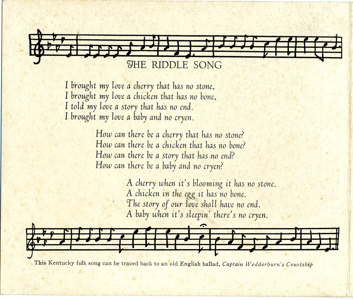 Evelyn K. Wells, a former staff worker at Pine Mountain, a long-time member of the Board of Trustees of Pine Mountain Settlement School, and later faculty at Wellesley College, transcribed the song in her 1956 book, The Ballad Tree. However, the transcription, taken from Cecil Sharp‘s English Folk Songs from the Southern Appalachians (1932), does not conform to this version which is listed as a Kentucky folk song. Variants of Appalachian songs abound and, within the repertoire of songs and ballads collected by Pine Mountain, there are variants a-plenty.