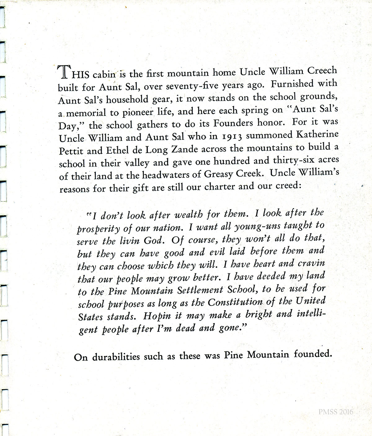 The 1943 spiral-bound calendar features quotes of the School founders as well as various photographs representing Pine Mountain Settlement School and the surrounding community in the early 1940s. The photographs are by Arthur Dodd, the staff photographer and principal and instructor at the School. During his tenure at the School, “Dodd,” as he was called, created many photographic images that were used in publicity and promotion of the institution.